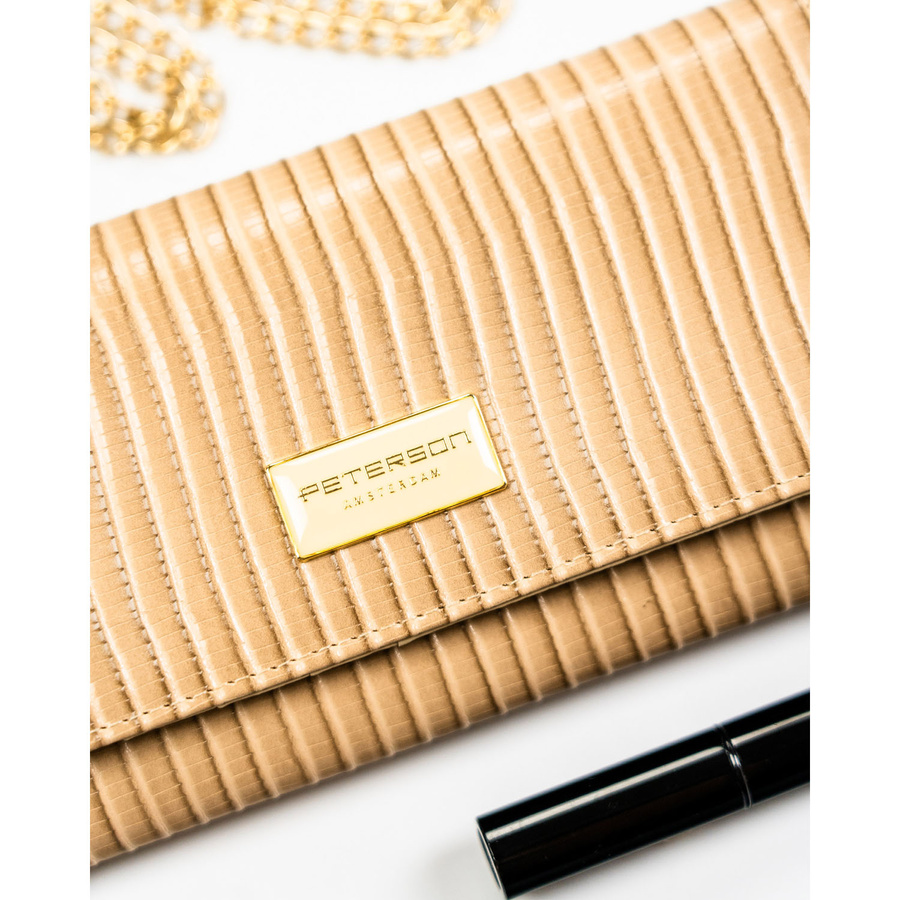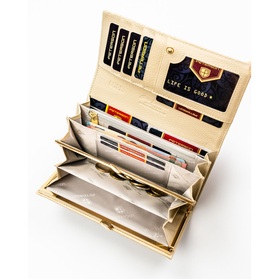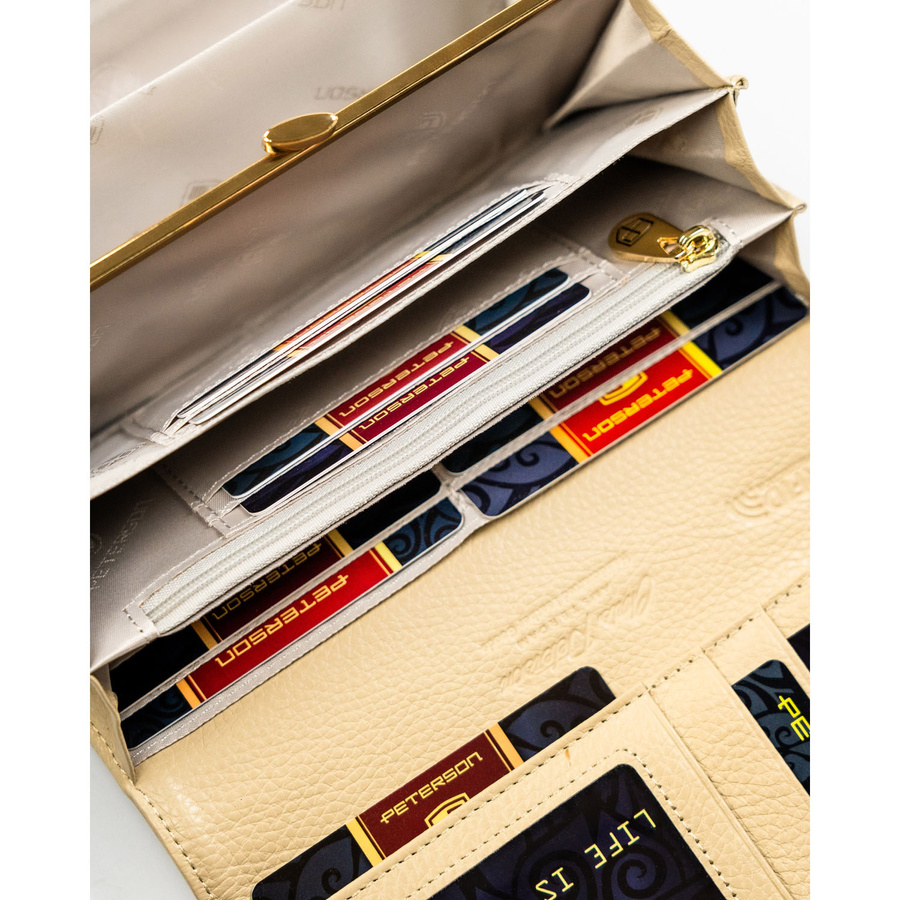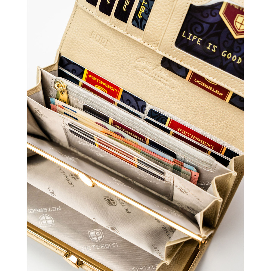 Beżowy portfel damski ze skóry naturalnej i ekologicznej zamykany zatrzaskiem, ozdobiony wzorem w plecionkę - Peterson