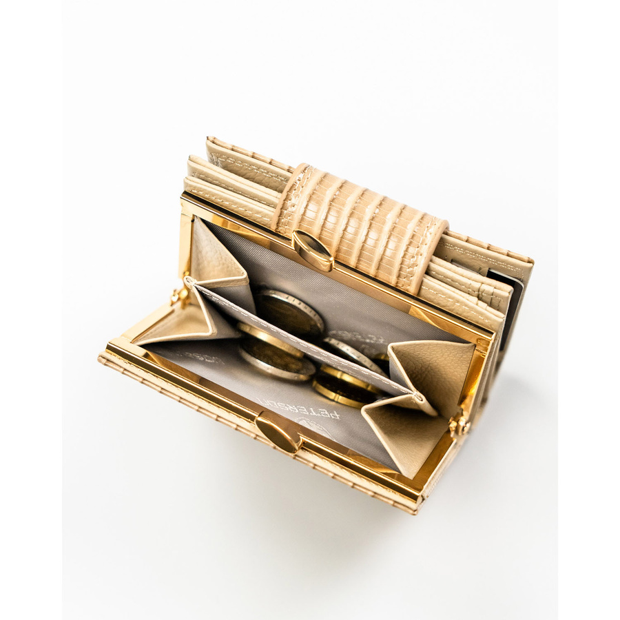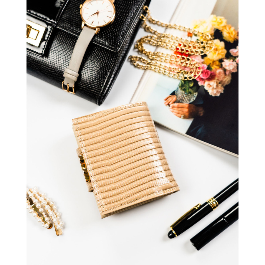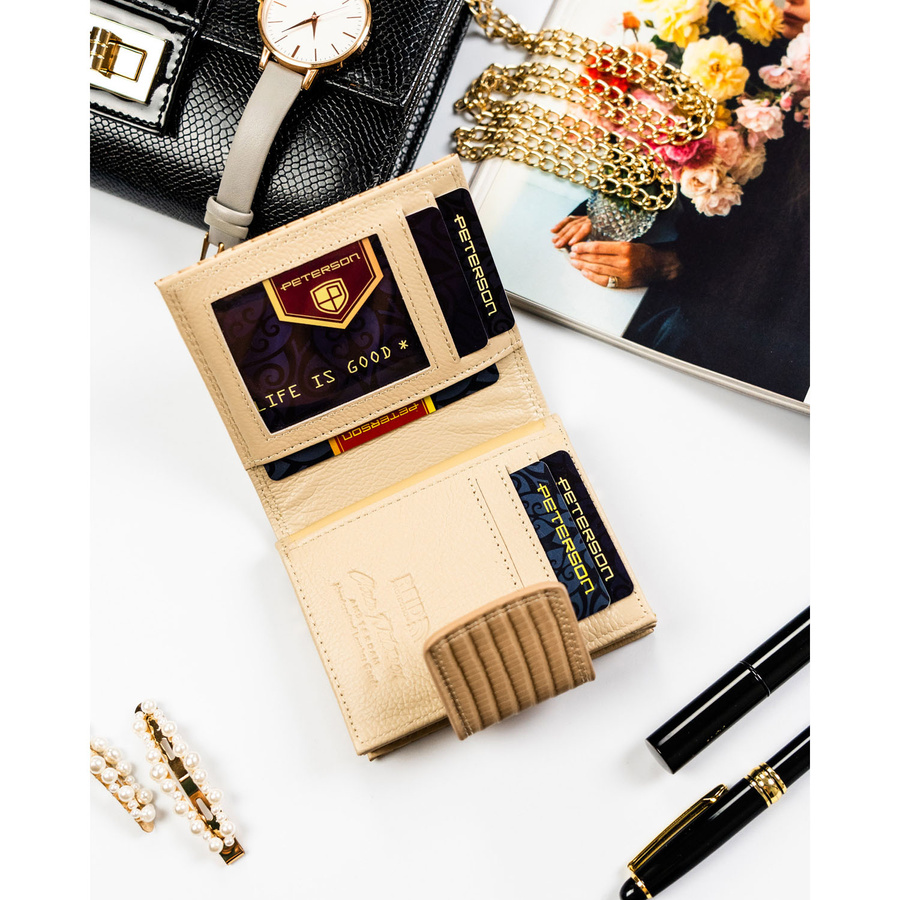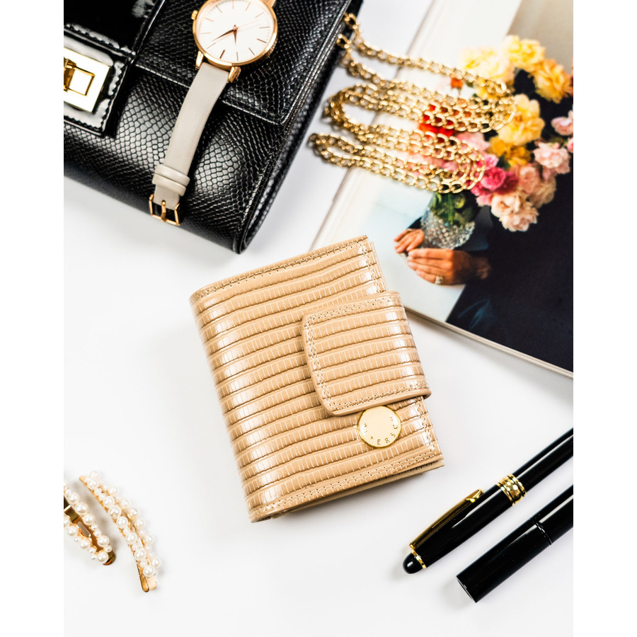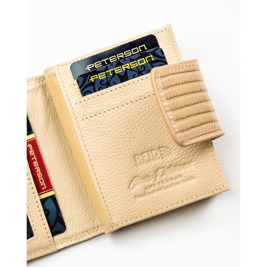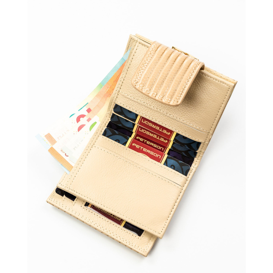 Beżowy portfel damski zamykany na bigiel i zatrzask, pokryty wzorem w plecionkę - Peterson