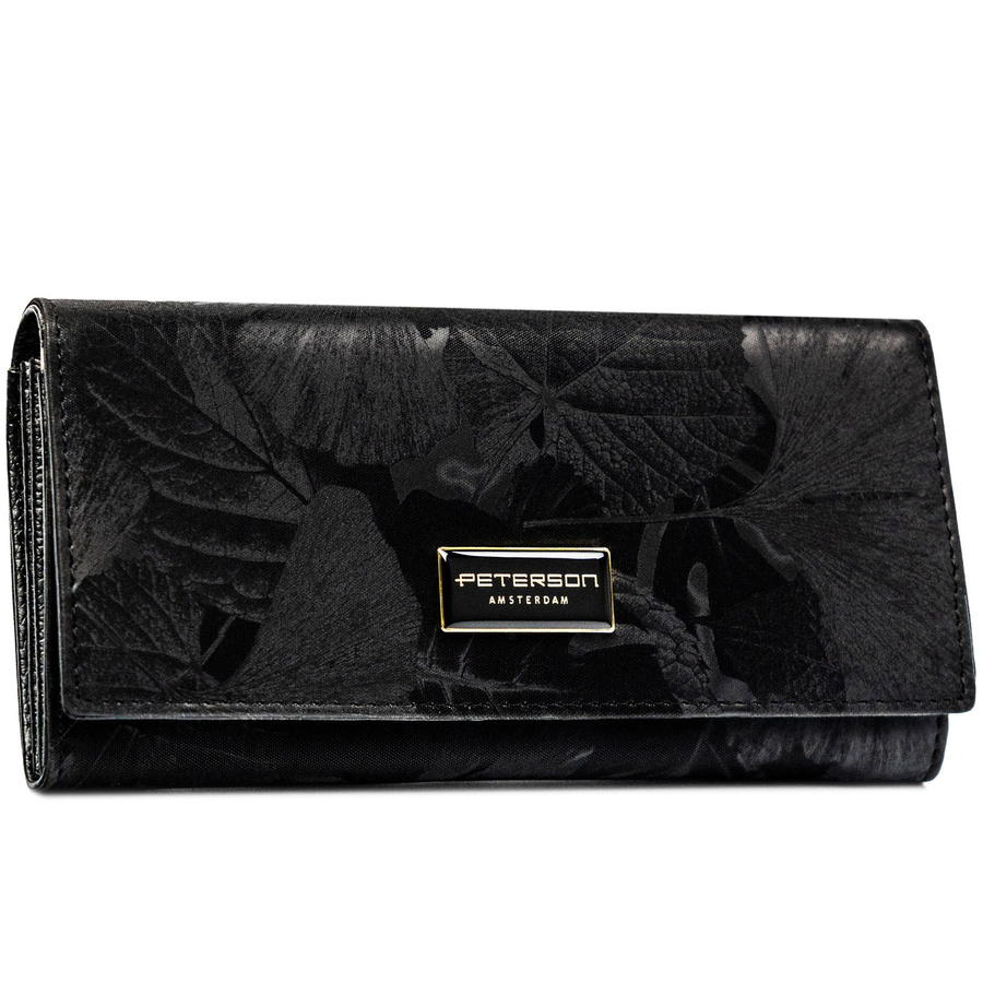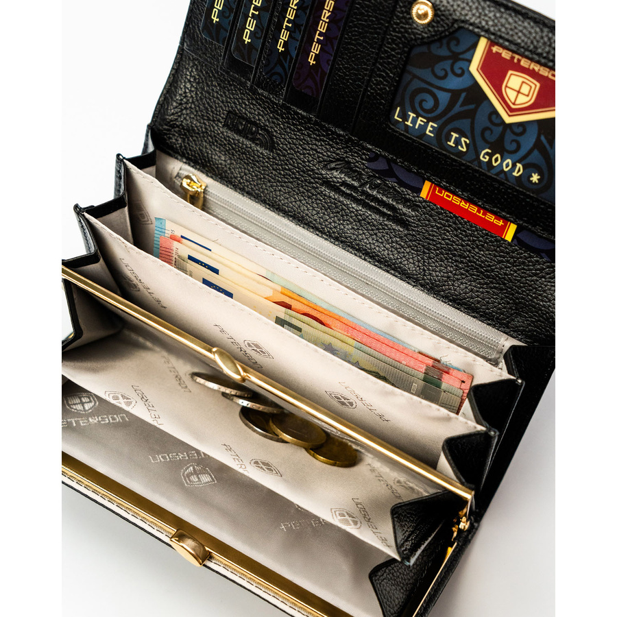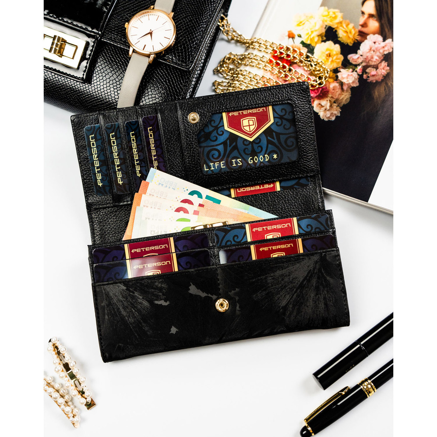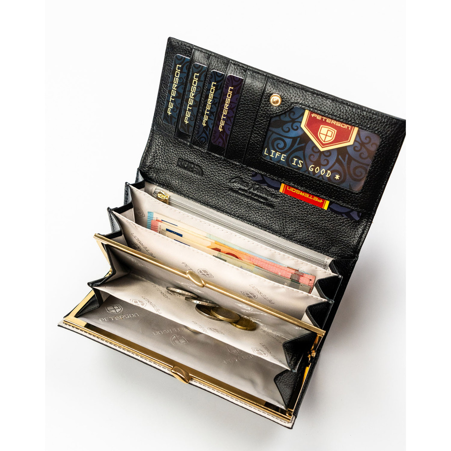 Duży portfel damski ze skóry naturalnej i ekologicznej w czarnym kolorze, zamykany zatrzaskiem - Peterson