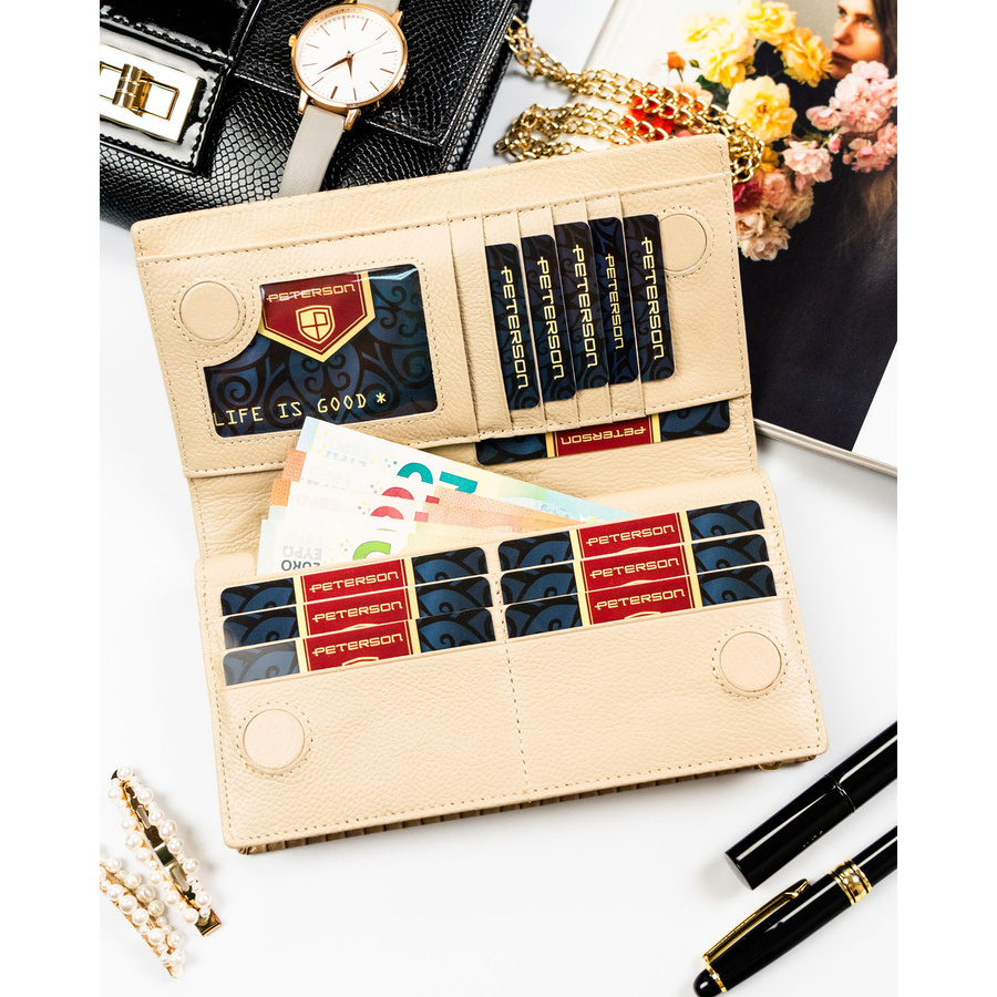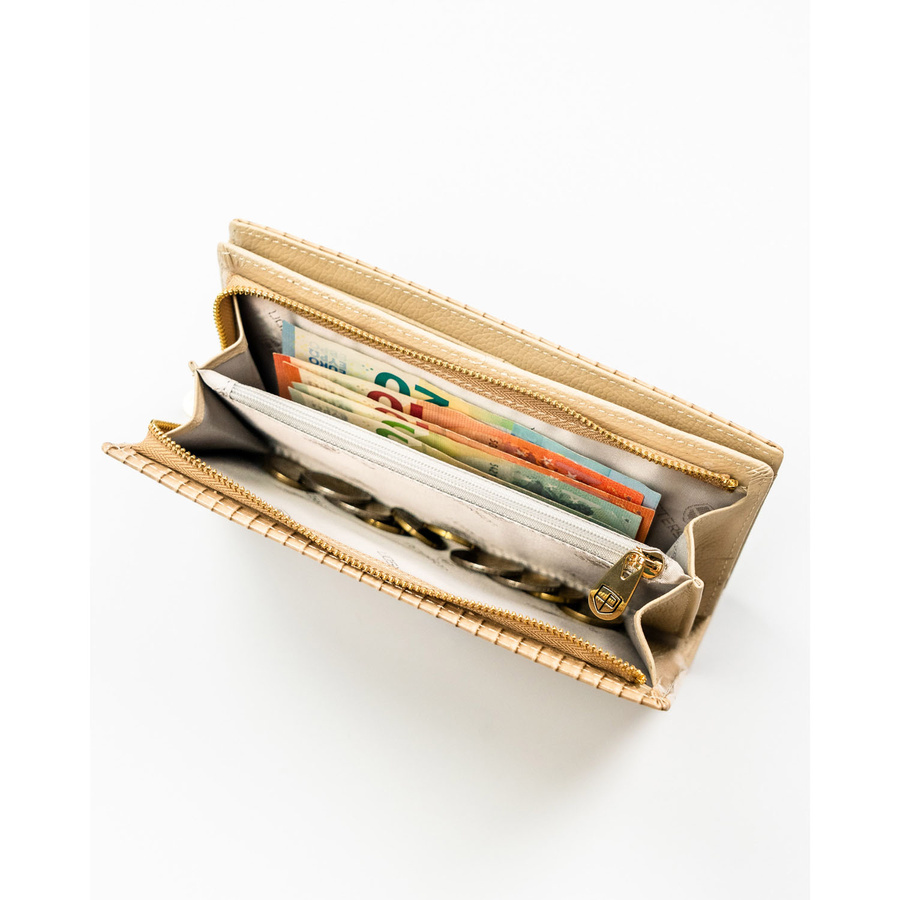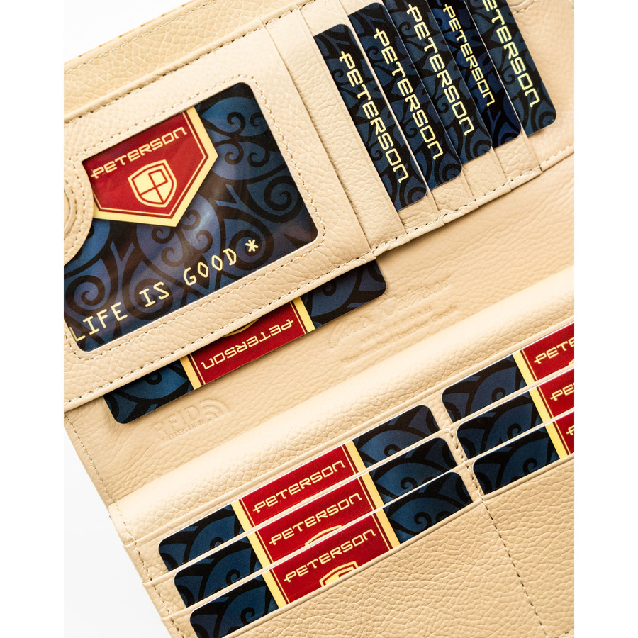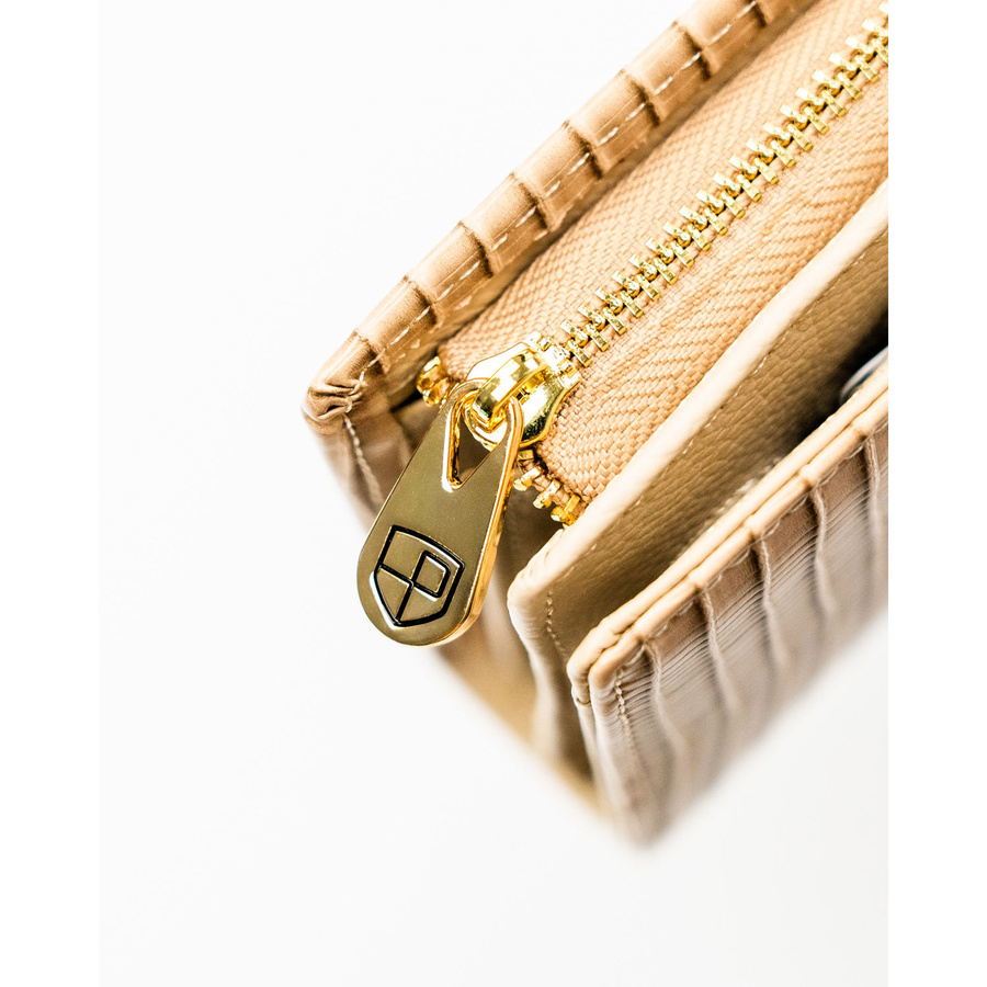 Beżowy portfel damski zamykany na magnes i suwak, zdobiony plecionką - Peterson