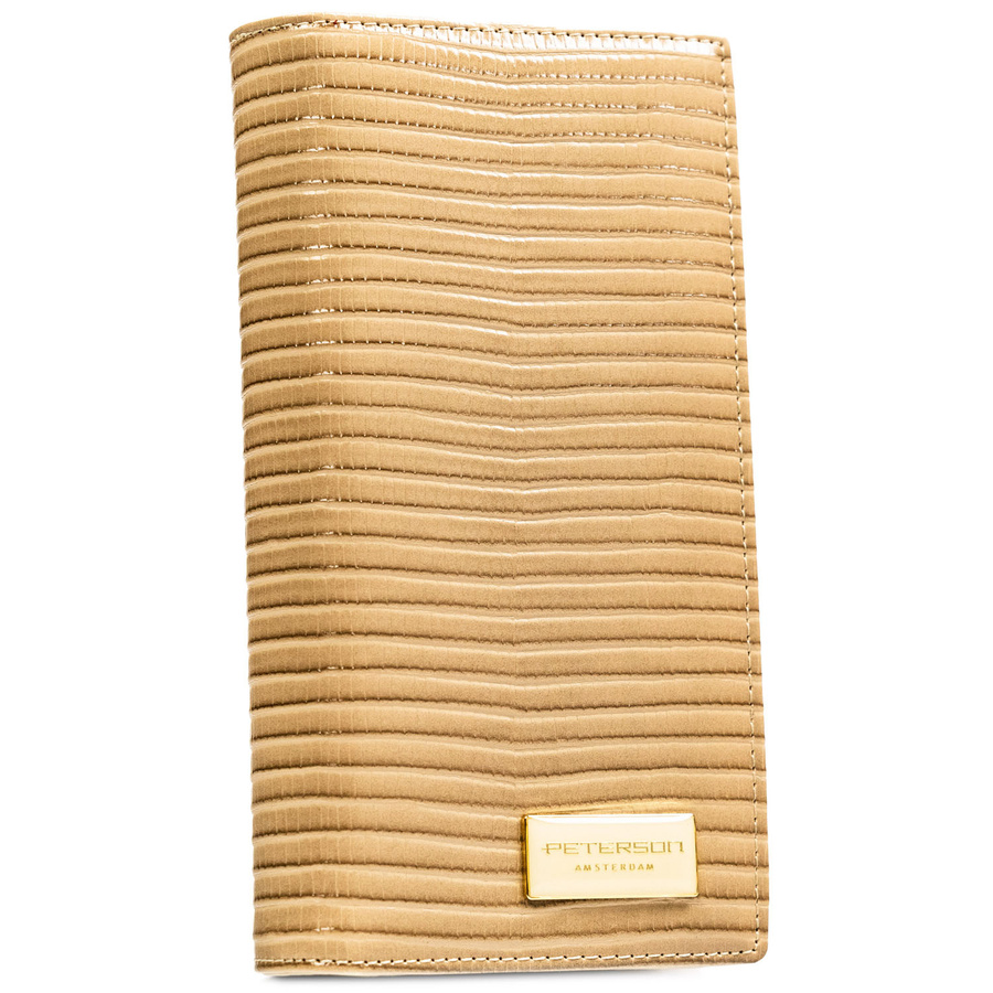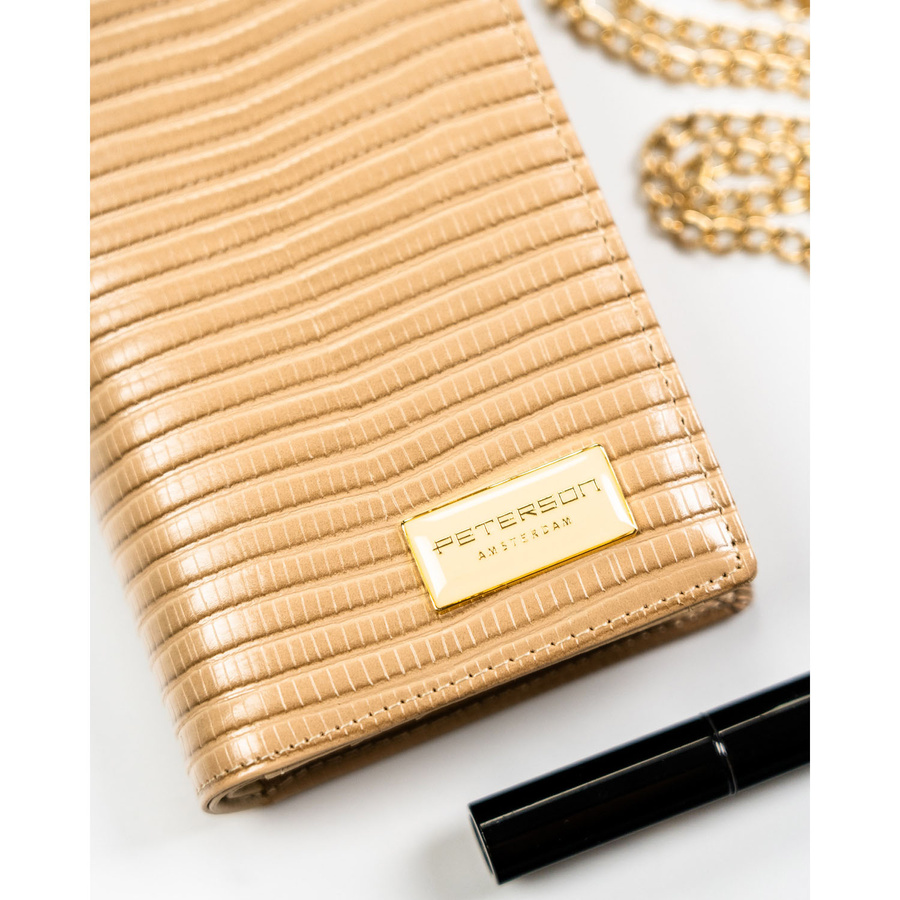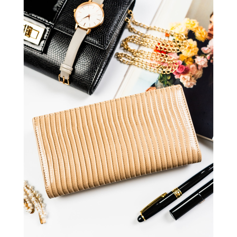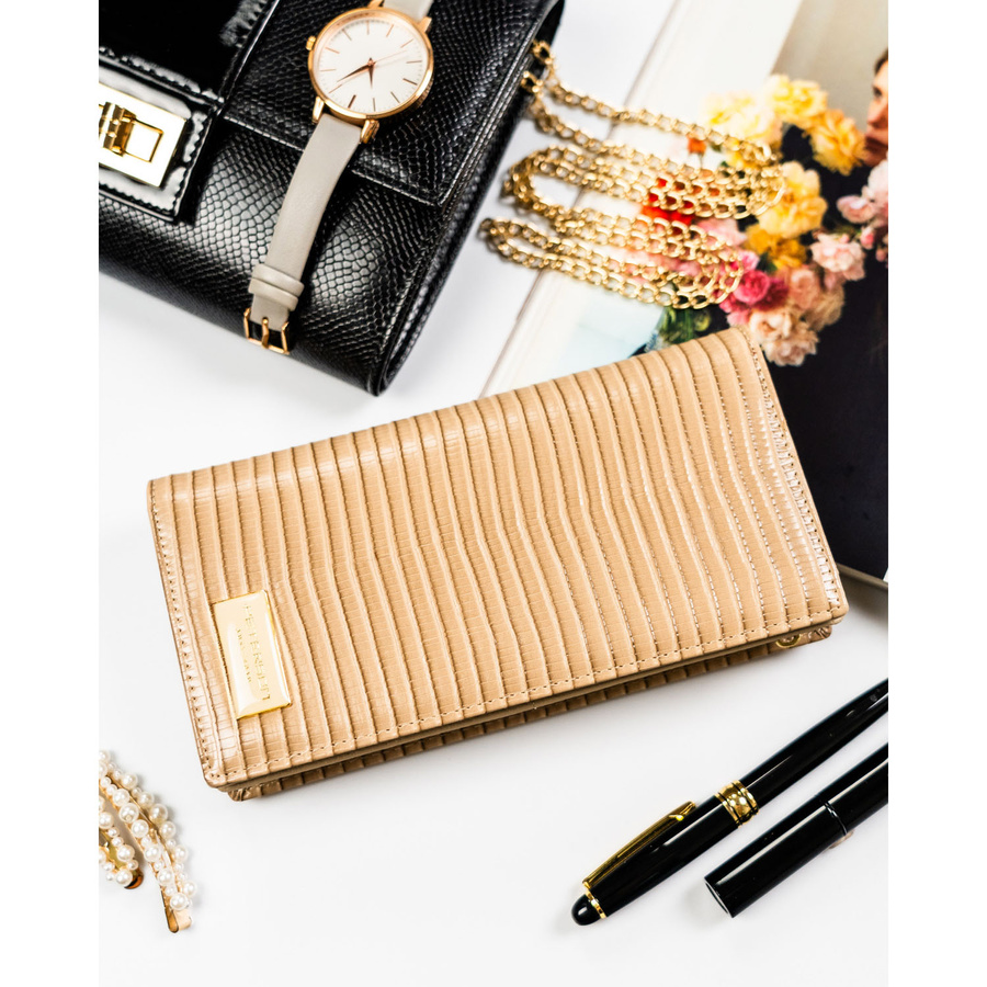 Beżowy portfel damski zamykany na magnes i suwak, zdobiony plecionką - Peterson