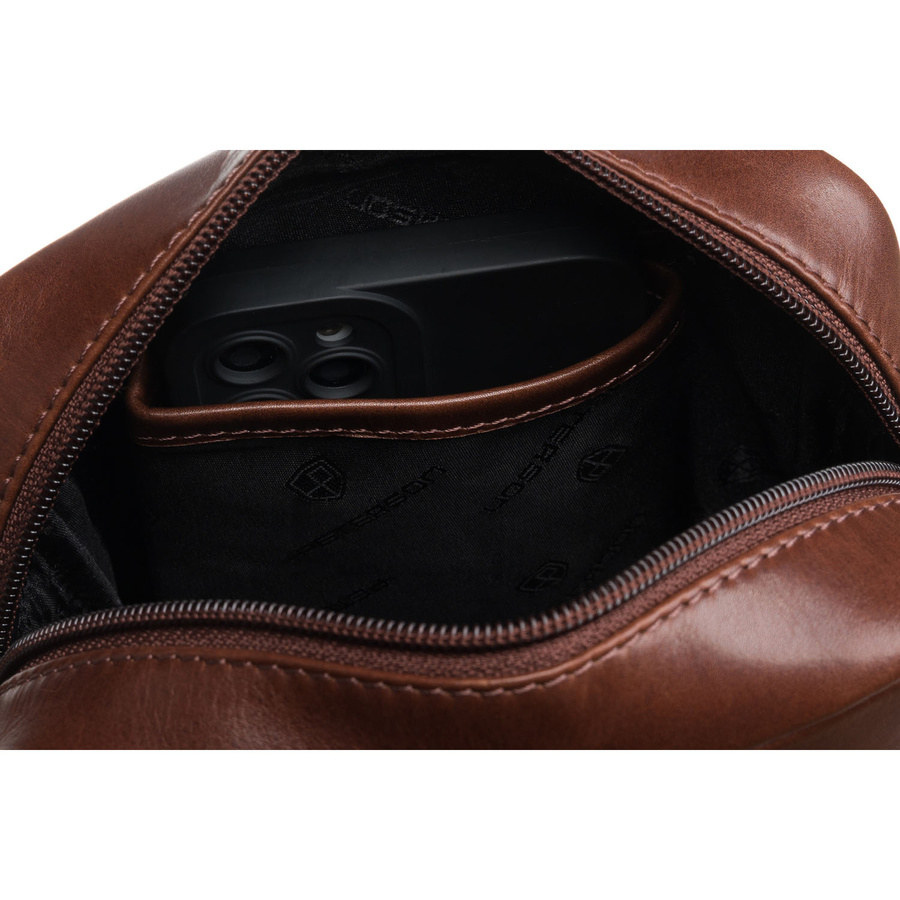 Saszetka jednokomorowa zamykana na zamek błyskawiczny. W komorze mieści się 1 kieszonka zapinana na suwak i 1 kieszonka na telefon obszyta skórą naturalną.