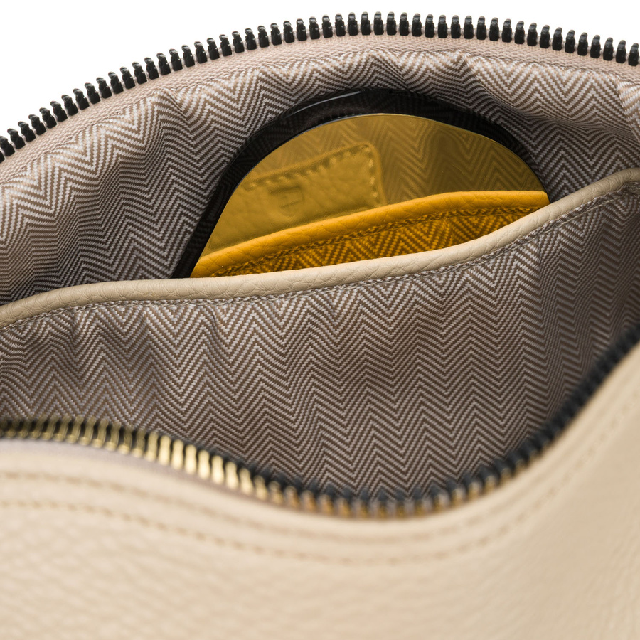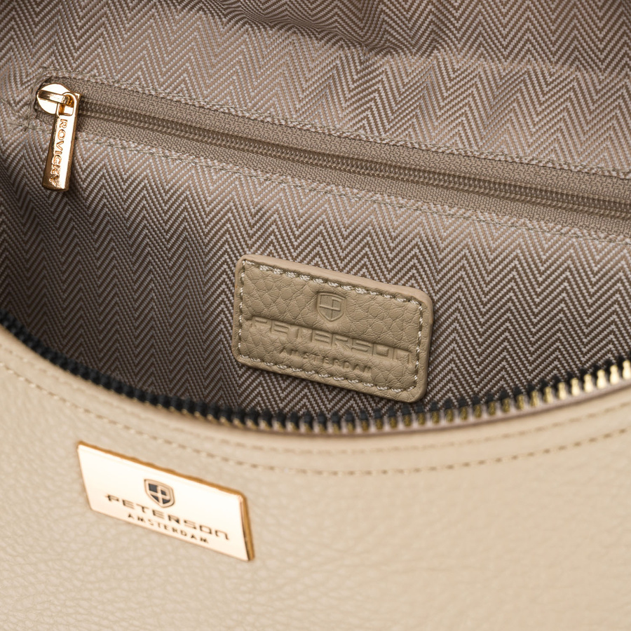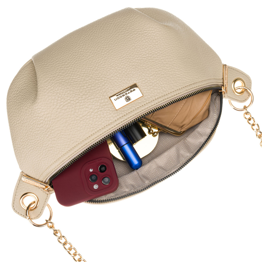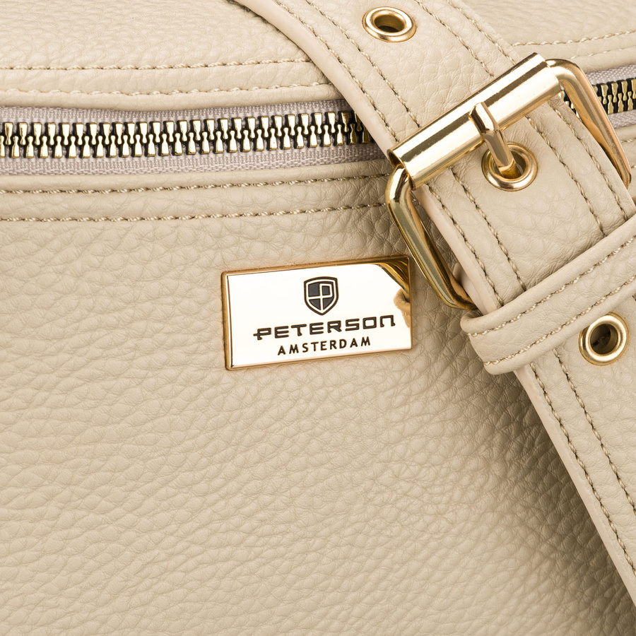 Beżowa saszetka damska ze skóry ekologicznej zamykana suwakiem, zawieszona na regulowanym pasku - Peterson