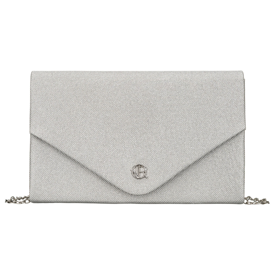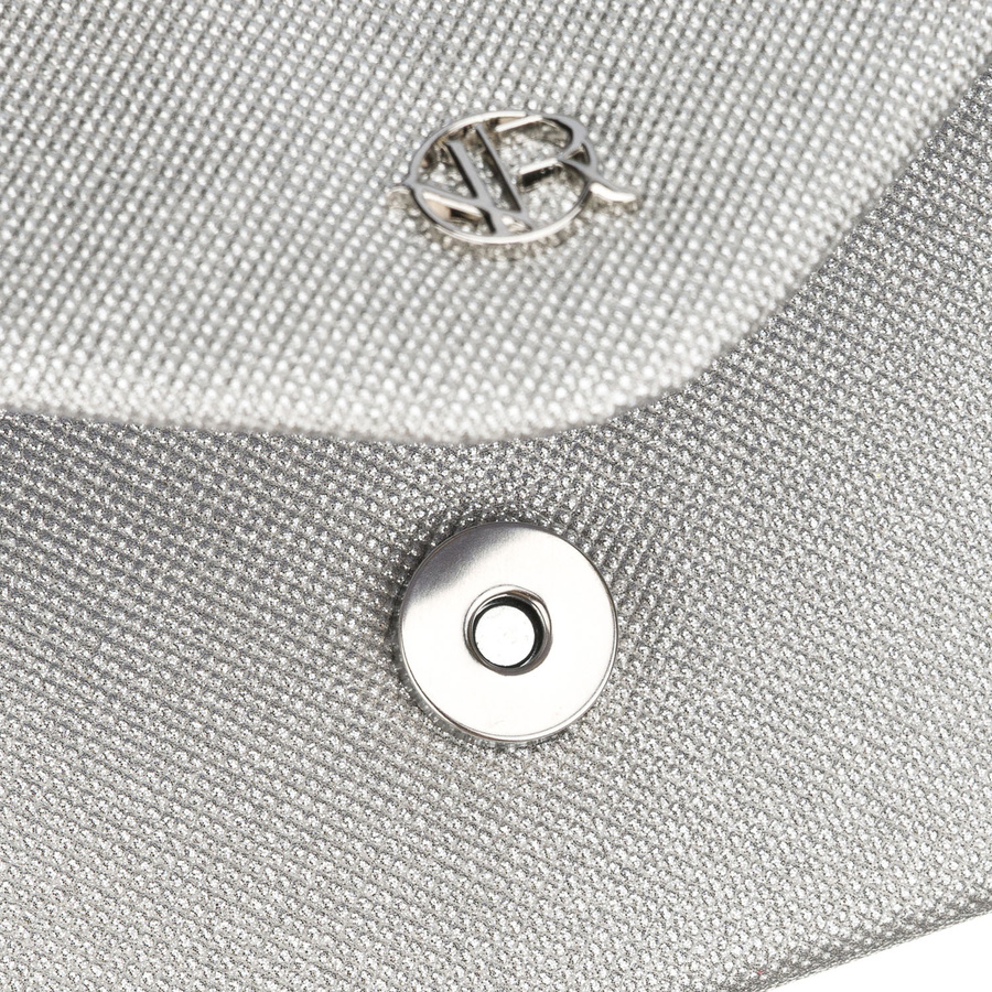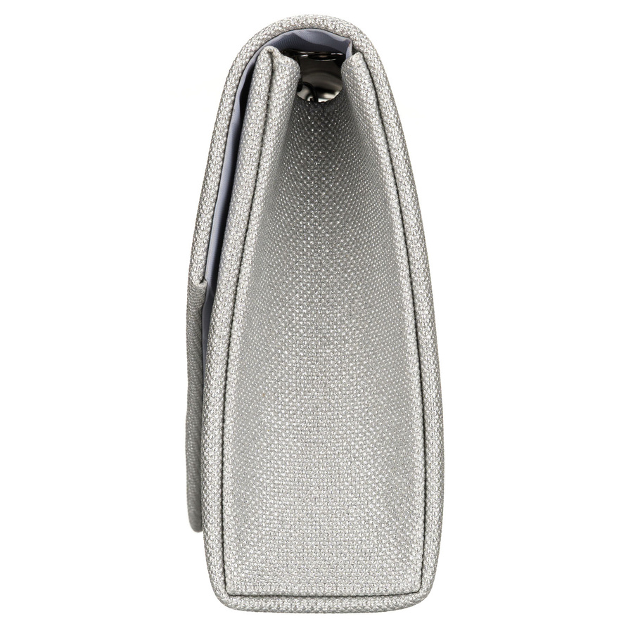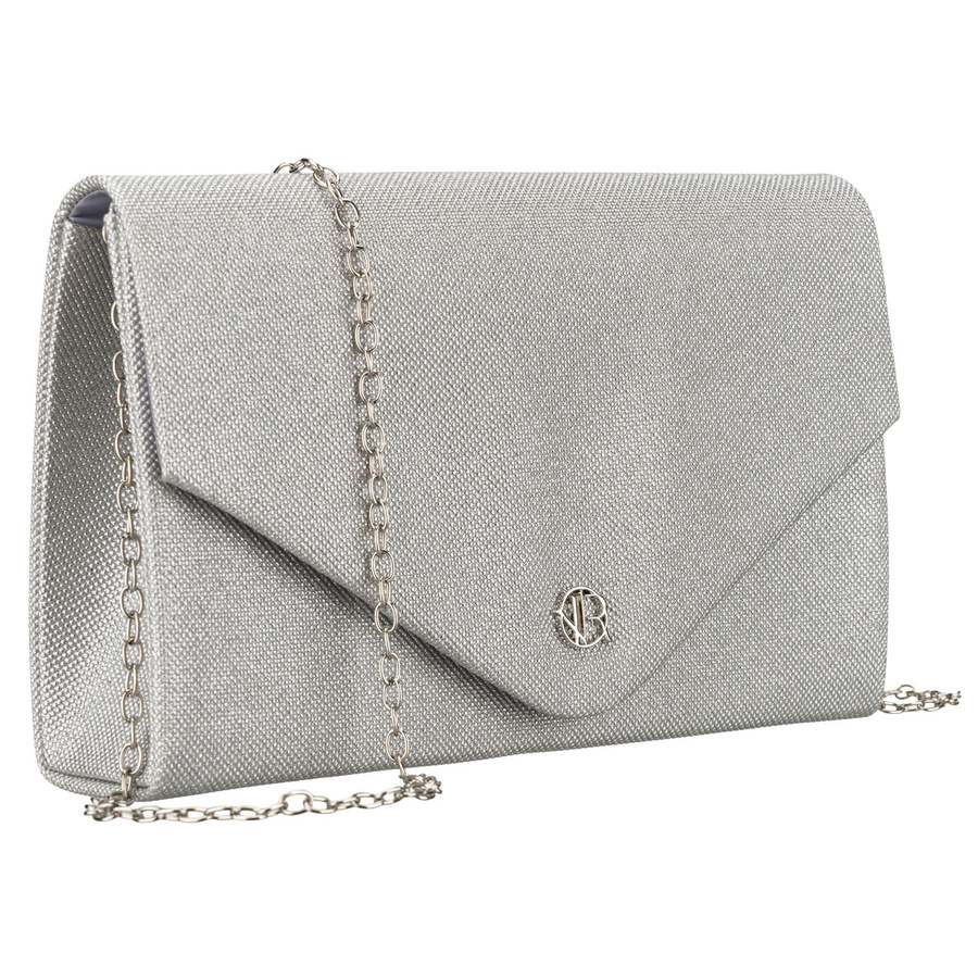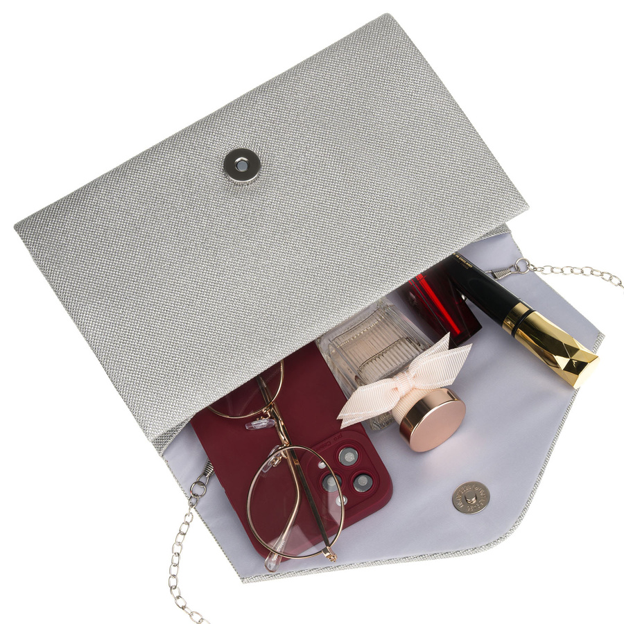 Brokatowa kopertówka damska w srebrnym kolorze zawieszona na eleganckim łańcuszku - Rovicky