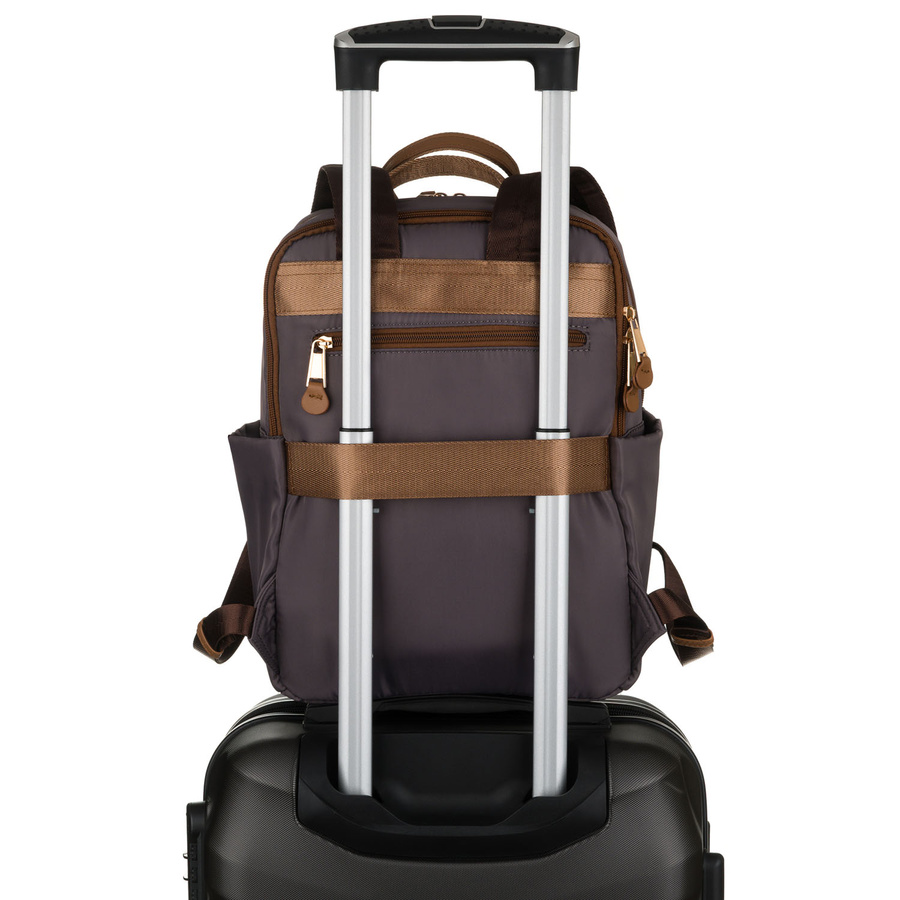 Z tyłu plecaka znajduje się pasek do mocowania na rączce walizki. To rozwiązanie szczególnie przydatne w podróży – plecak stabilnie trzyma się na bagażu, a Ty możesz poruszać się wygodnie i bez dodatkowego obciążenia.