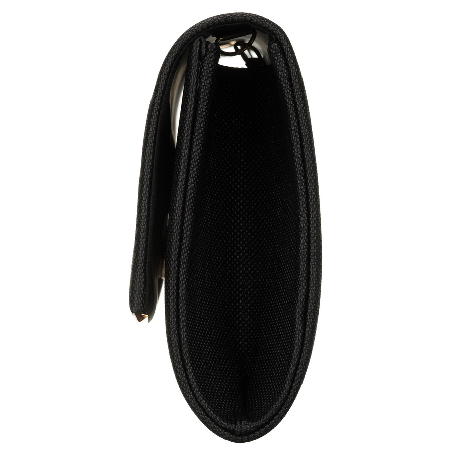 • Kopertówka damska z tkaniny syntetycznej w czarnym kolorze. Zawieszona na złotym łańcuszku, który dodaje biżuteryjnego charakteru. Jednokomorowa, zapinana klipsem magnetycznym.