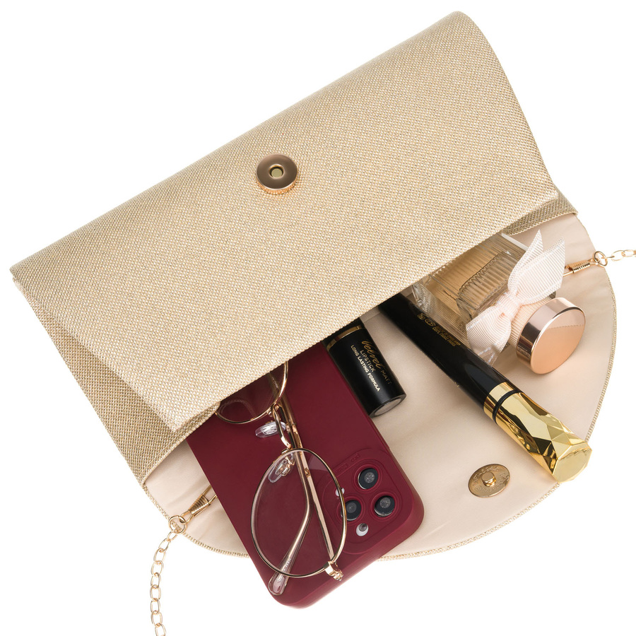 • Złota kopertówka damska z tkaniny syntetycznej, brokatowa. Zawieszona na złotym łańcuszku, który dodaje biżuteryjnego charakteru. Jednokomorowa, zapinana klipsem magnetycznym.