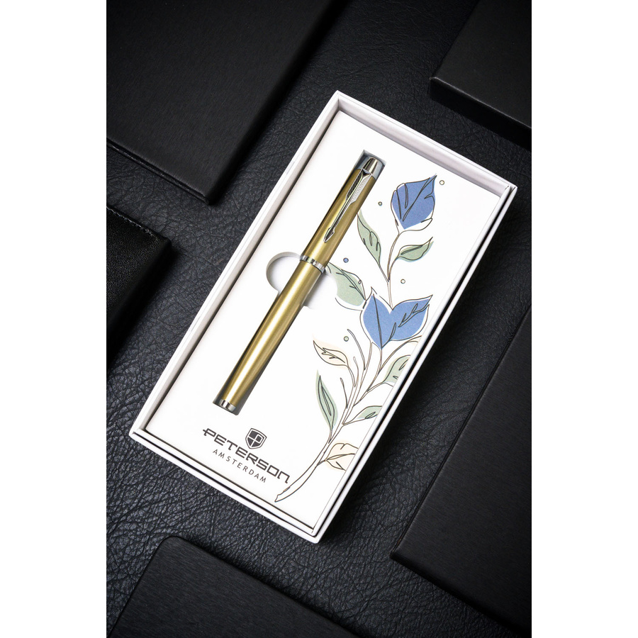 Długopis zapakowany jest w eleganckie pudełko prezentowe z delikatnym, roślinnym motywem graficznym. To idealny upominek dla osób, które cenią styl, elegancję i funkcjonalność – sprawdzi się jako prezent firmowy, dla nauczyciela, studenta lub partnera biznesowego.