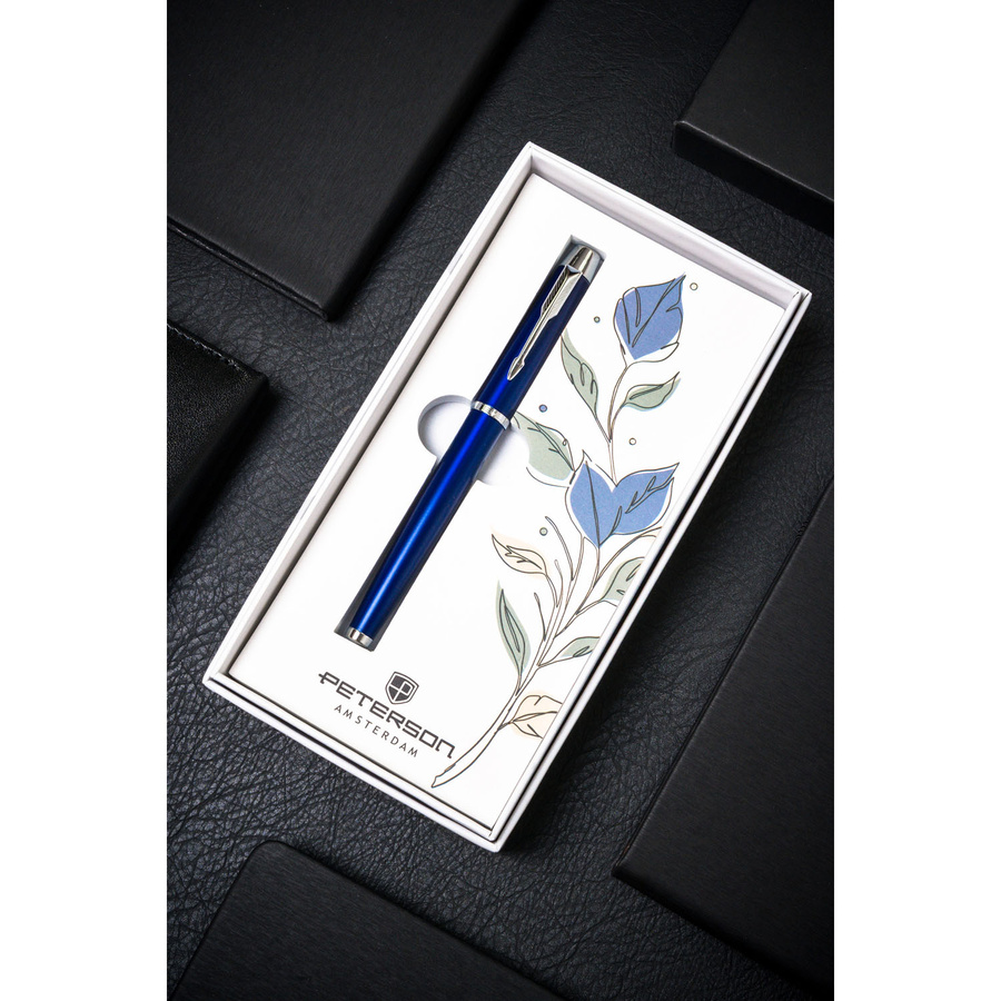 Długopis zapakowany jest w eleganckie pudełko prezentowe z delikatnym, roślinnym motywem graficznym. To idealny upominek dla osób, które cenią styl, elegancję i funkcjonalność – sprawdzi się jako prezent firmowy, dla nauczyciela, studenta lub partnera biznesowego.