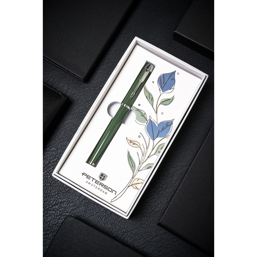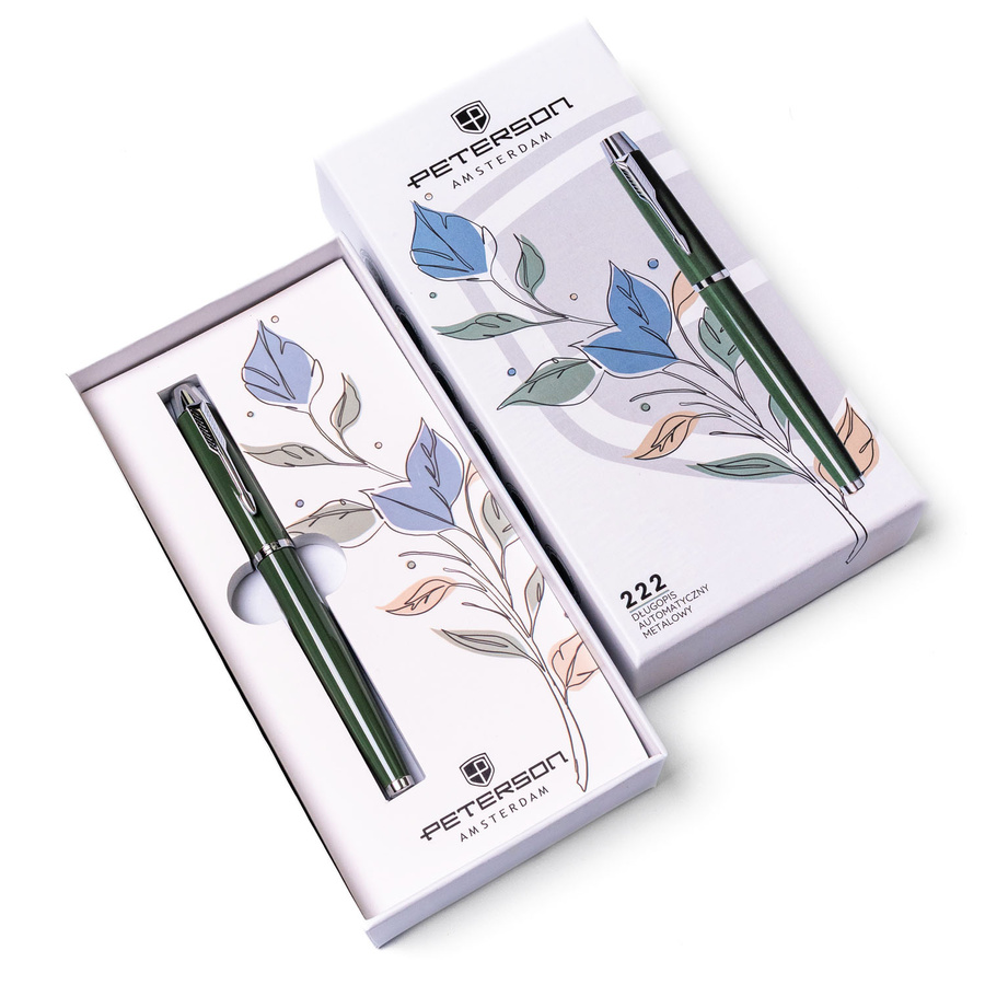 Długopis zapakowany jest w eleganckie pudełko prezentowe z delikatnym, roślinnym motywem graficznym. To idealny upominek dla osób, które cenią styl, elegancję i funkcjonalność – sprawdzi się jako prezent firmowy, dla nauczyciela, studenta lub partnera biznesowego.