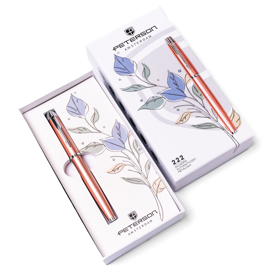 Długopis zapakowany jest w eleganckie pudełko prezentowe z delikatnym, roślinnym motywem graficznym. To idealny upominek dla osób, które cenią styl, elegancję i funkcjonalność – sprawdzi się jako prezent firmowy, dla nauczyciela, studenta lub partnera biznesowego.