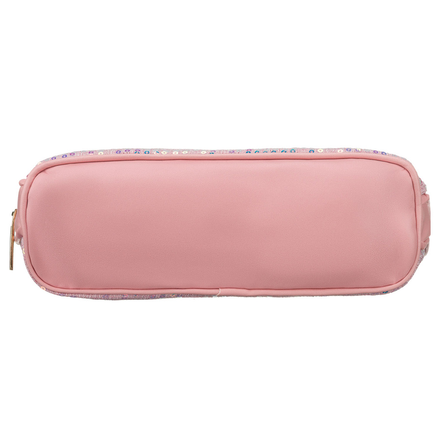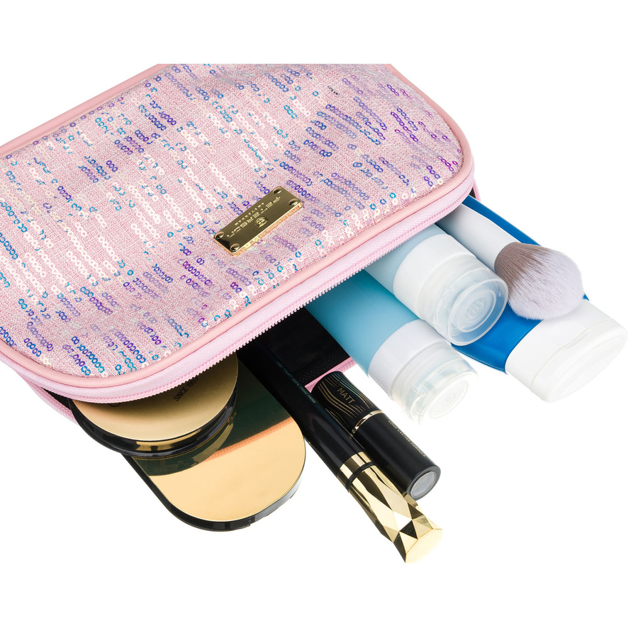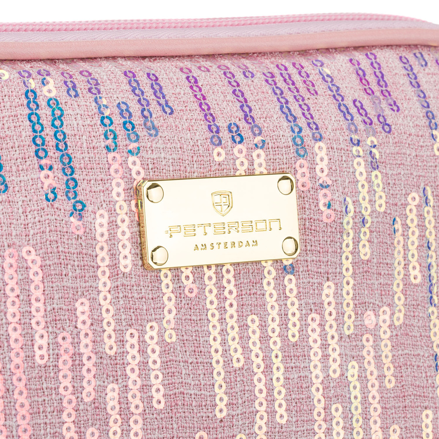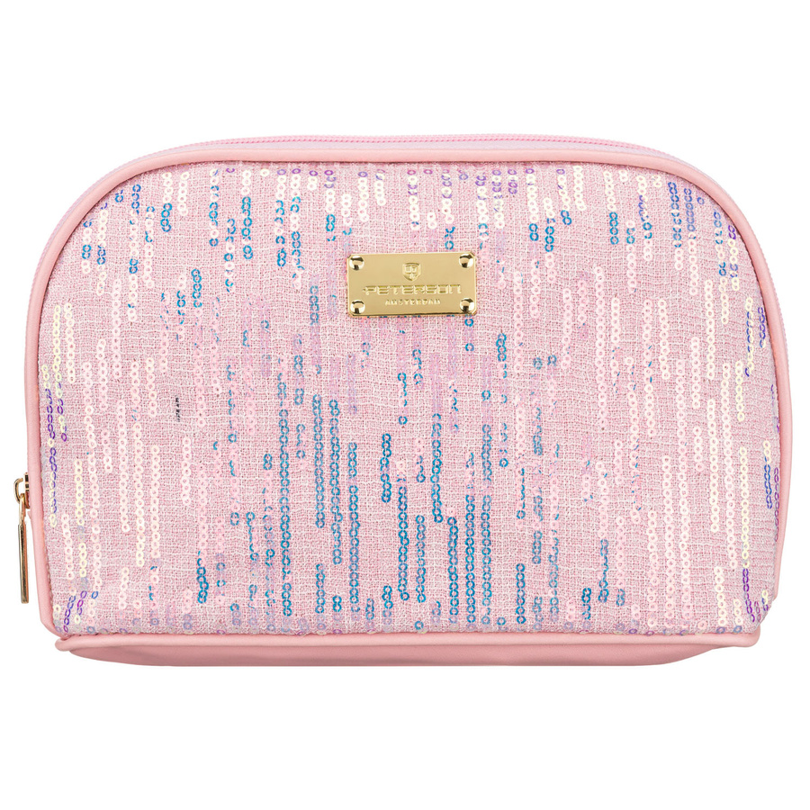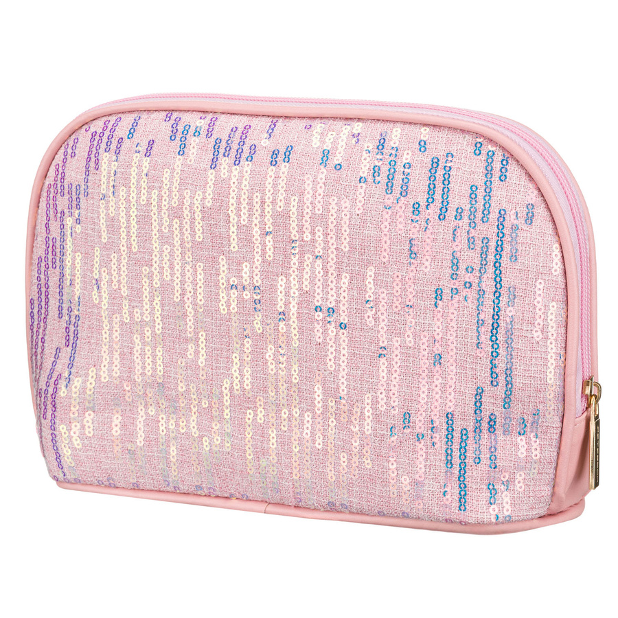 • Kosmetyczka z materiału syntetycznego w różowym kolorze, ozdobiona cekinami. Pomieści wszystkie najważniejsze kosmetyki i akcesoria. Zamykana na wygodny suwak. Jednokomorowa.