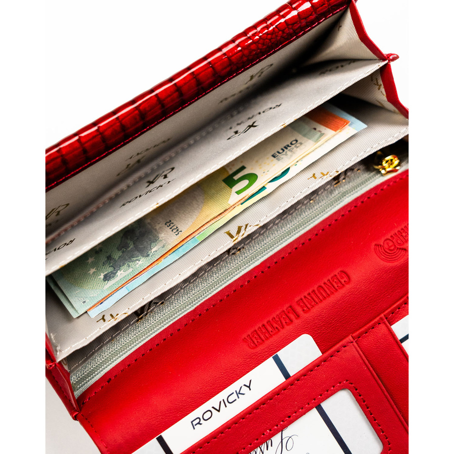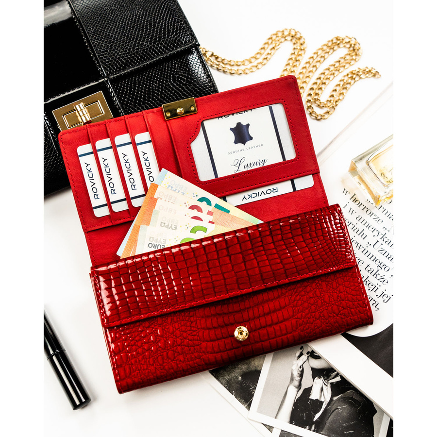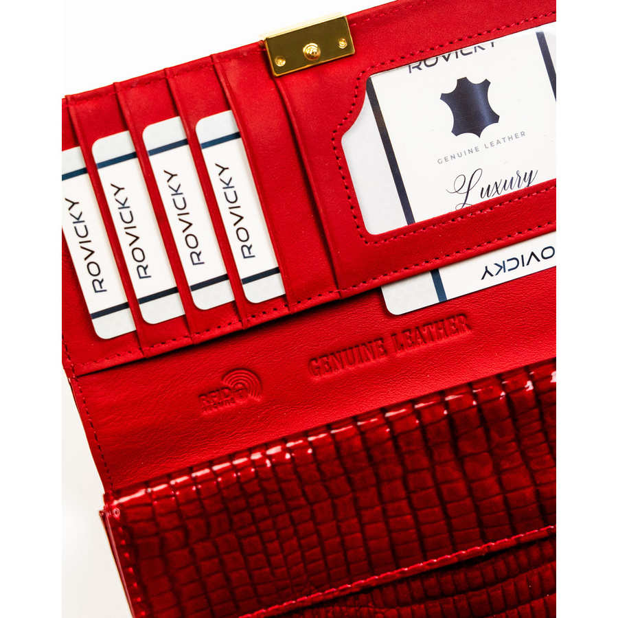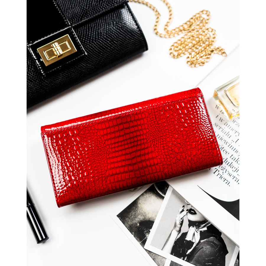Lakierowany portfel damski ze skóry naturalnej w czerwonym kolorze zamykany na zatrzask - Rovicky