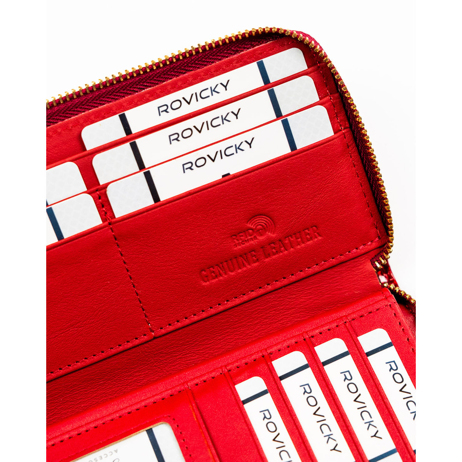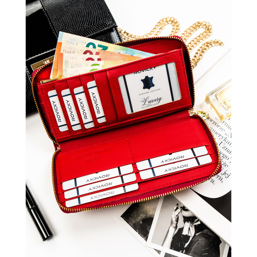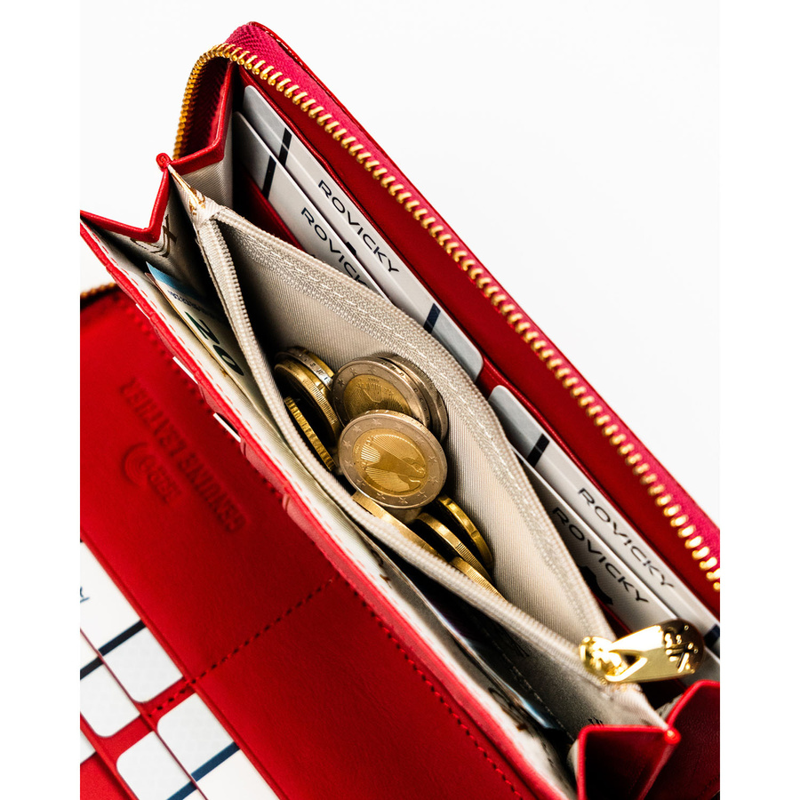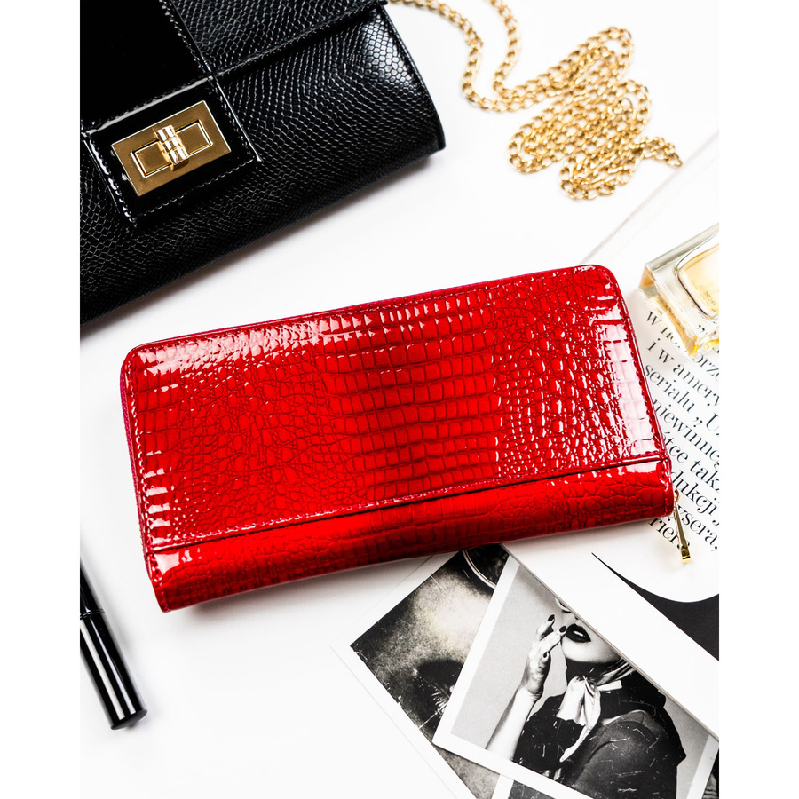 • Portfel-piórnik damski wykonany ze skóry naturalnej w czerwonym kolorze. Lakierowany i zamykany suwakiem. Portfel w orientacji poziomej, mieści dowód rejestracyjny. Wyposażony w system RFID. Posiada aż 13 przegródek na karty.