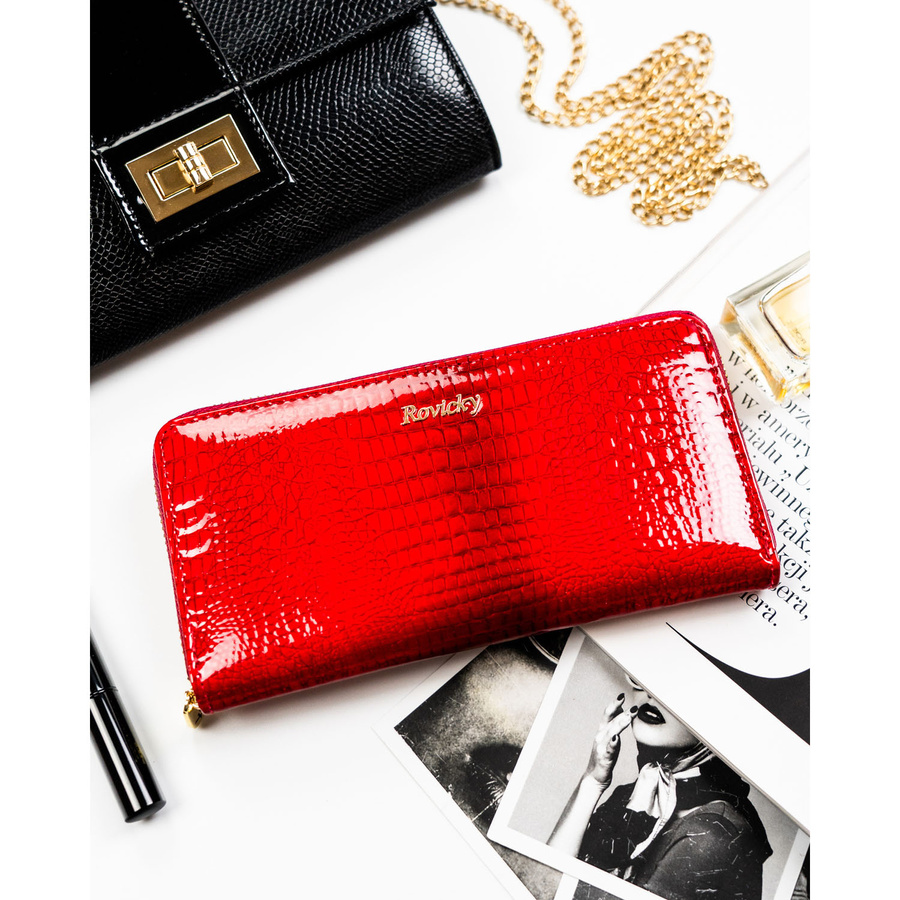 Lakierowany portfel w typie piórnika ze skóry naturalnej w czerwonym kolorze zamykany na suwak - Rovicky