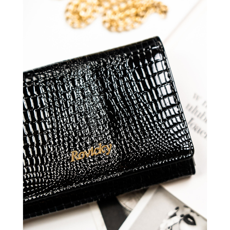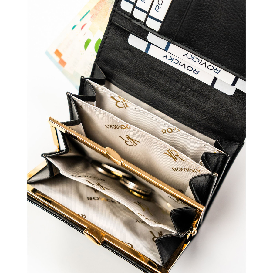 Średni, czarny portfel damski ze skóry naturalnej zamykany zatrzaskiem - Rovicky