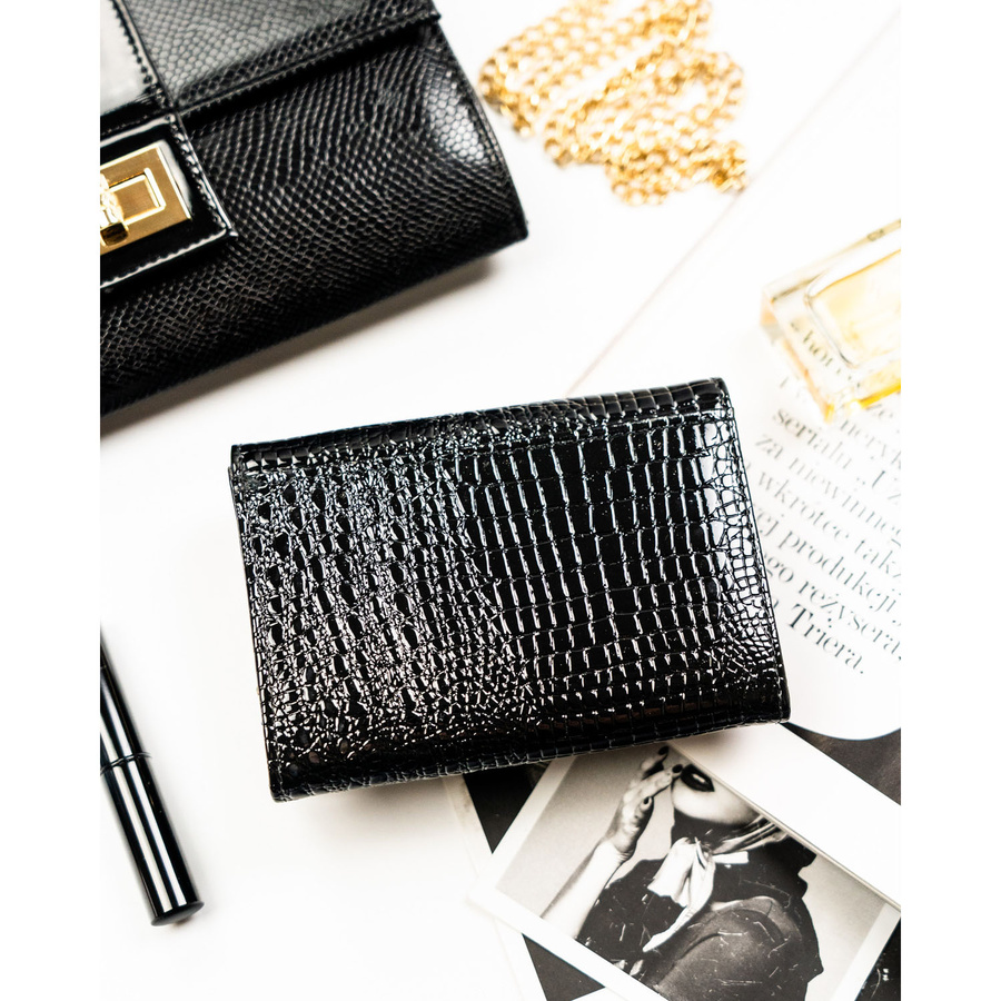 • Czarny portfel damski wykonany ze skóry naturalnej. Lakierowany i zamykany na trwały zatrzask. Portfel w orientacji poziomej, mieści dowód rejestracyjny. Wyposażony w system RFID. Zapakowany w firmowe pudełko.