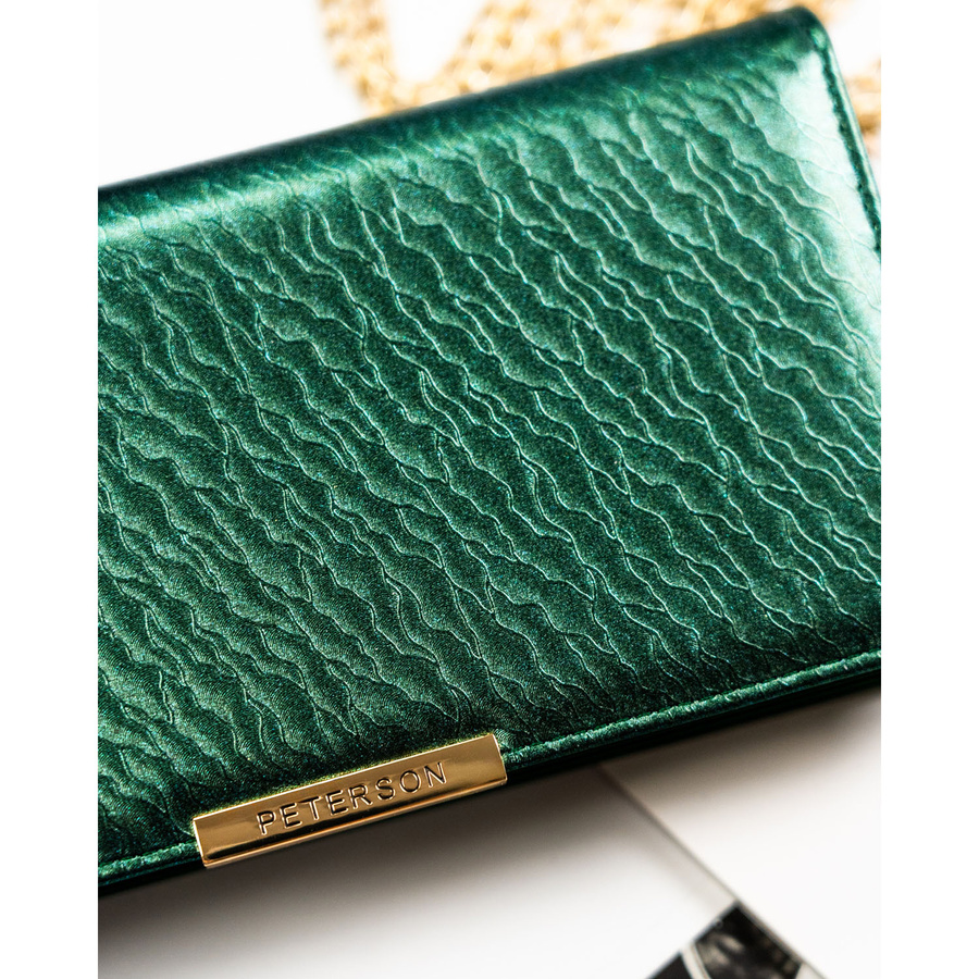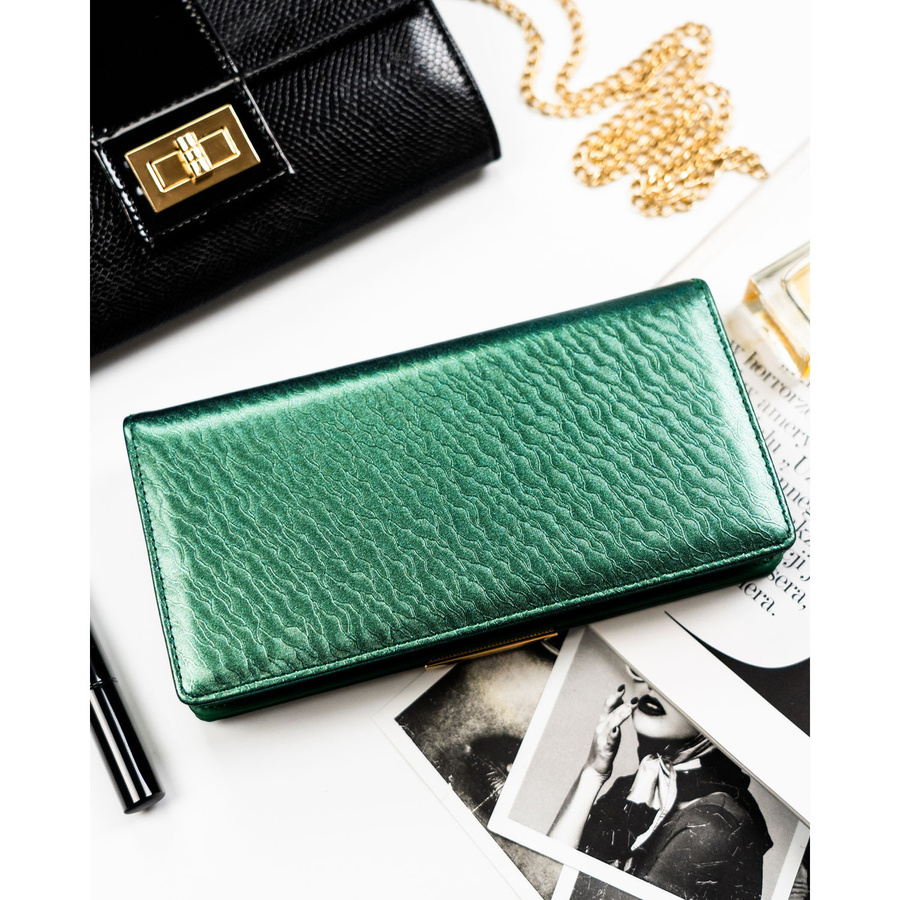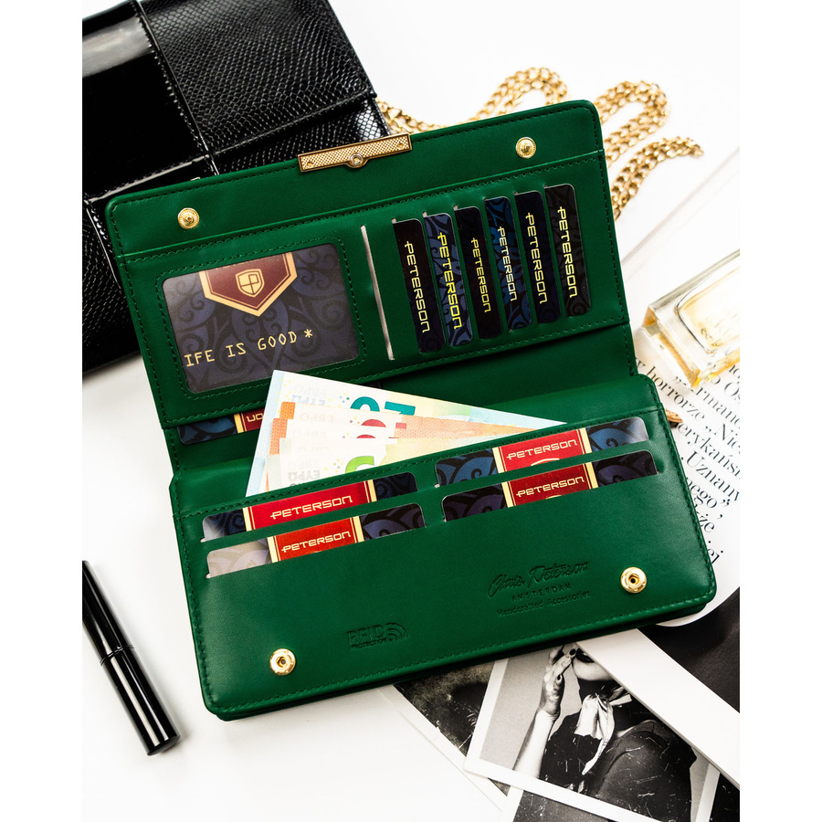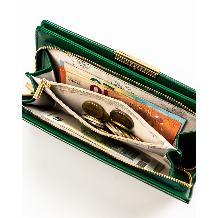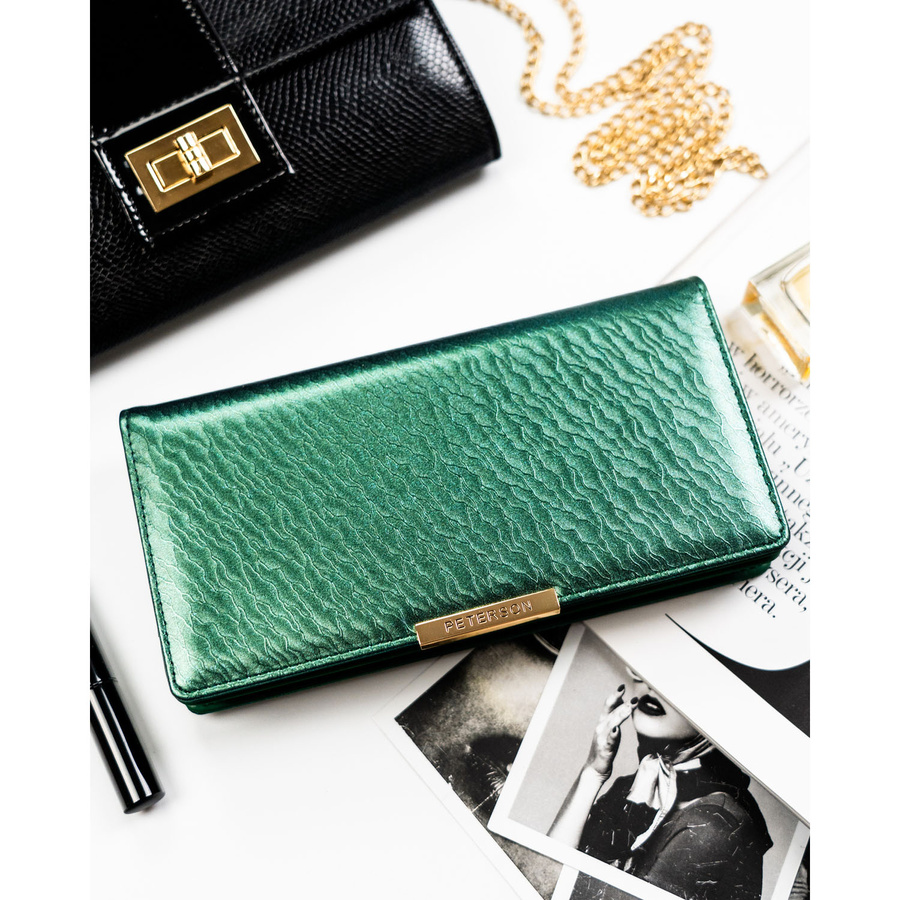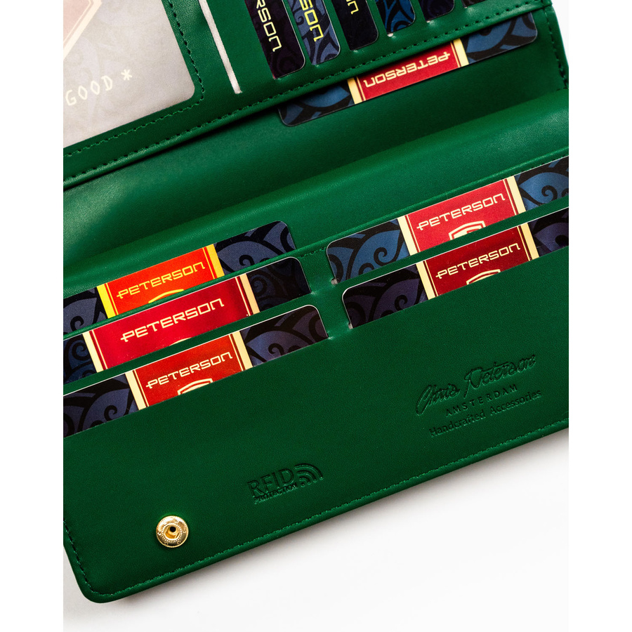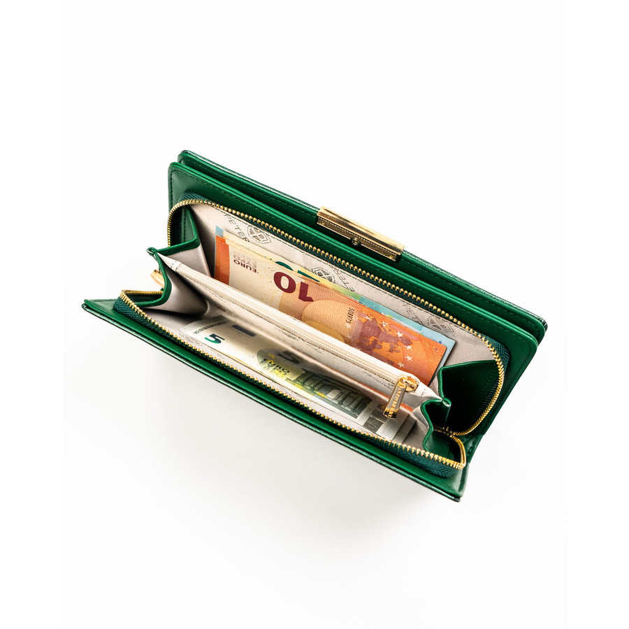 Zielony portfel damski ze skóry ekologicznej zamykany na zatrzask i suwak - Peterson