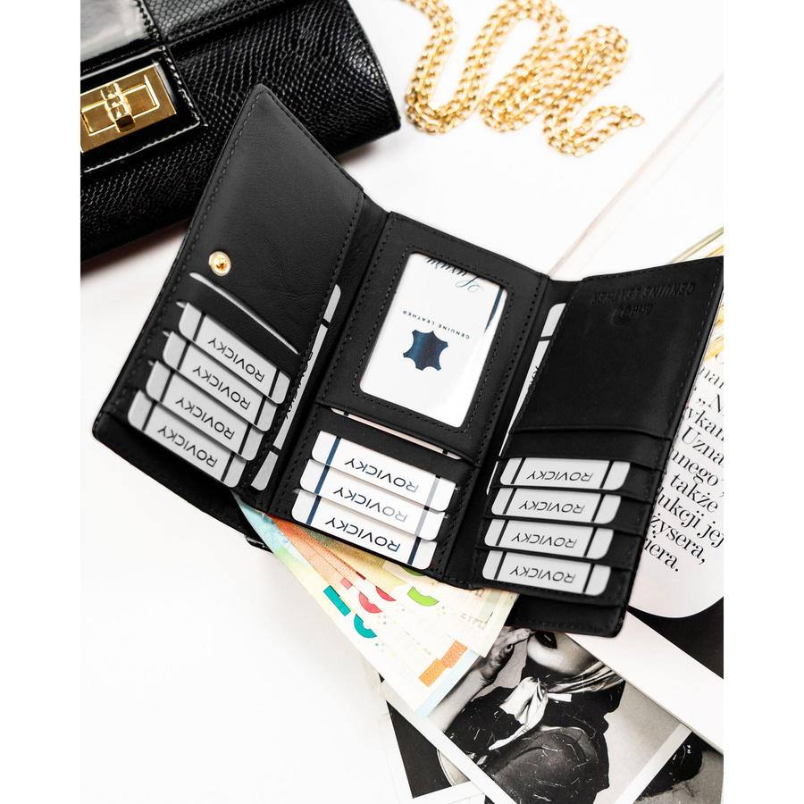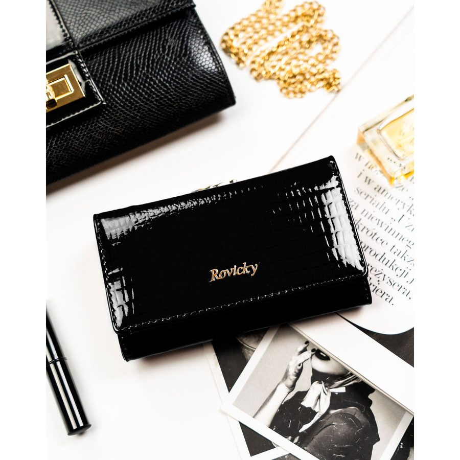 Średni portfel damski ze skóry naturalnej w czarnym kolorze zamykany na bigiel i zatrzask - Rovicky