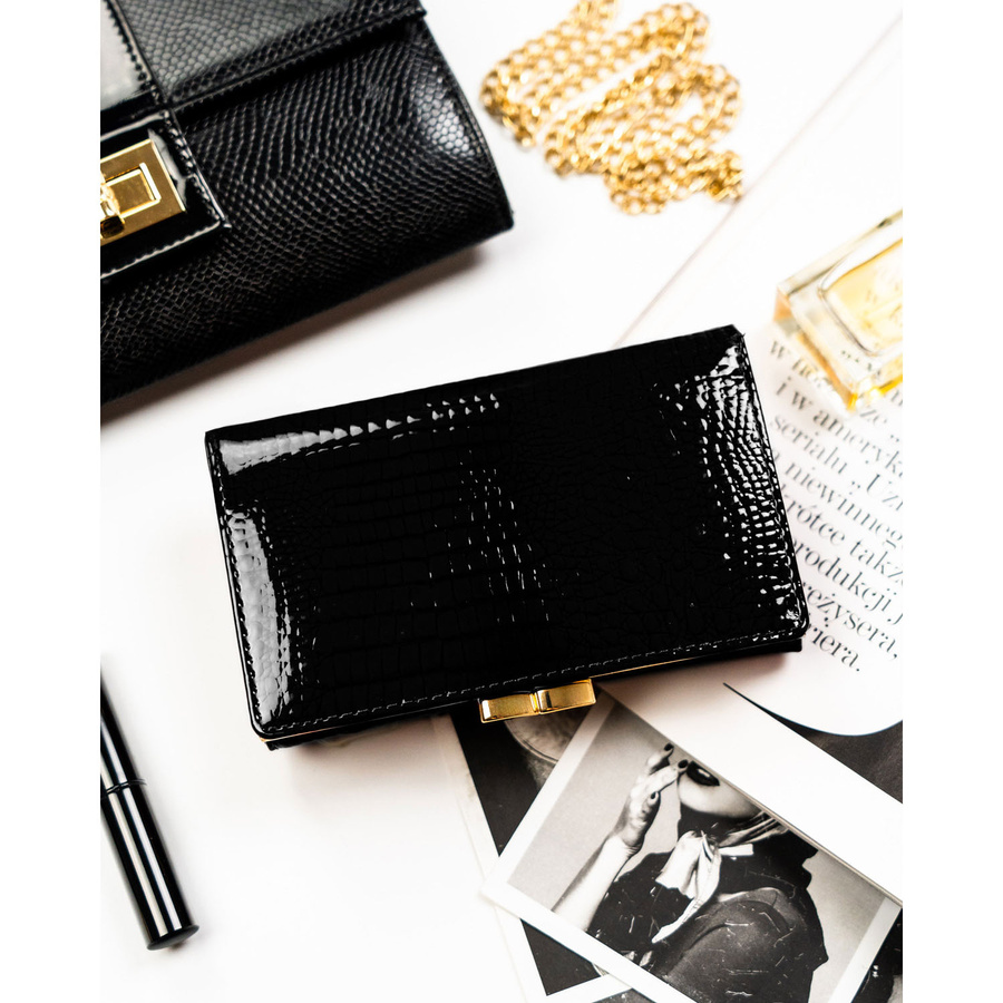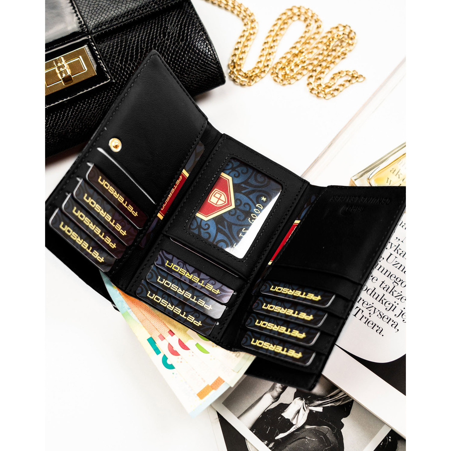 • Portfel damski wykonany ze skóry naturalnej w czarnym kolorze. Lakierowany i zamykany na trwały zatrzask oraz bigiel. Portfel w orientacji poziomej, mieści dowód rejestracyjny. Wyposażony w system RFID. Posiada aż 14 przegródek na karty.