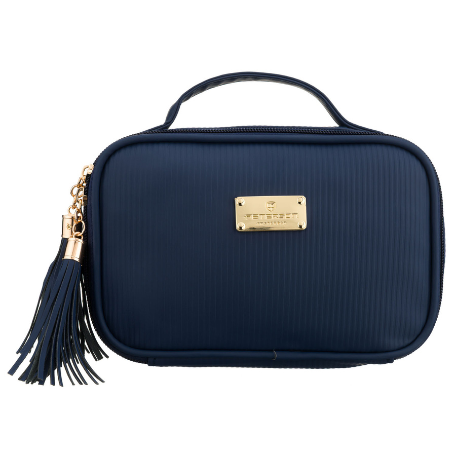 Granatowa kosmetyczka z tkaniny syntetycznej wyposażona w cztery przegródki, jednokomorowa - Peterson