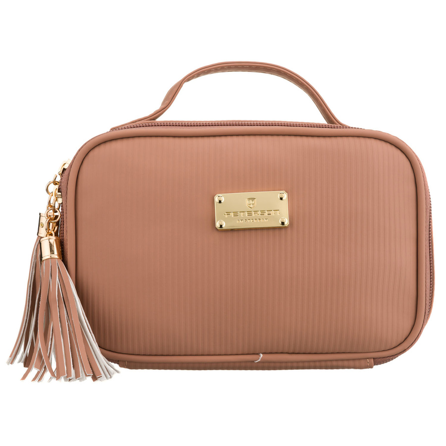 Jednokomorowa kosmetyczka z tkaniny syntetycznej w beżowym kolorze wyposażona praktyczny uchwyt - Peterson