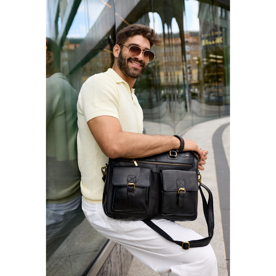 • Skórzana torba na laptopa w czarnym kolorze. Doskonała do pracy, na spotkania biznesowe i codzienne wyjścia z laptopem czy dokumentami A4. Mieści laptopa do 13,3 cala. Wyposażona w wygodne uchwyty i dopinany, regulowany pasek.