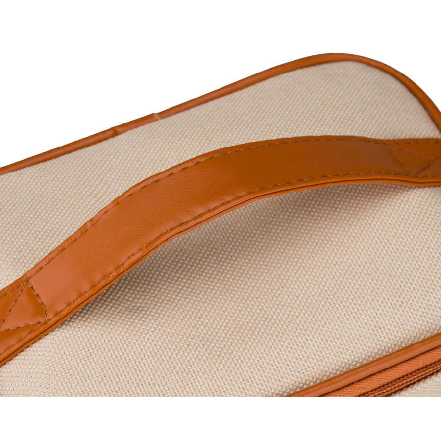 • Beżowo-brązowa kosmetyczka z tkaniny syntetycznej. Jednokomorowa, zamykana bezpiecznym suwakiem. Kosmetyczka z praktycznym, wygodnym uchwytem.