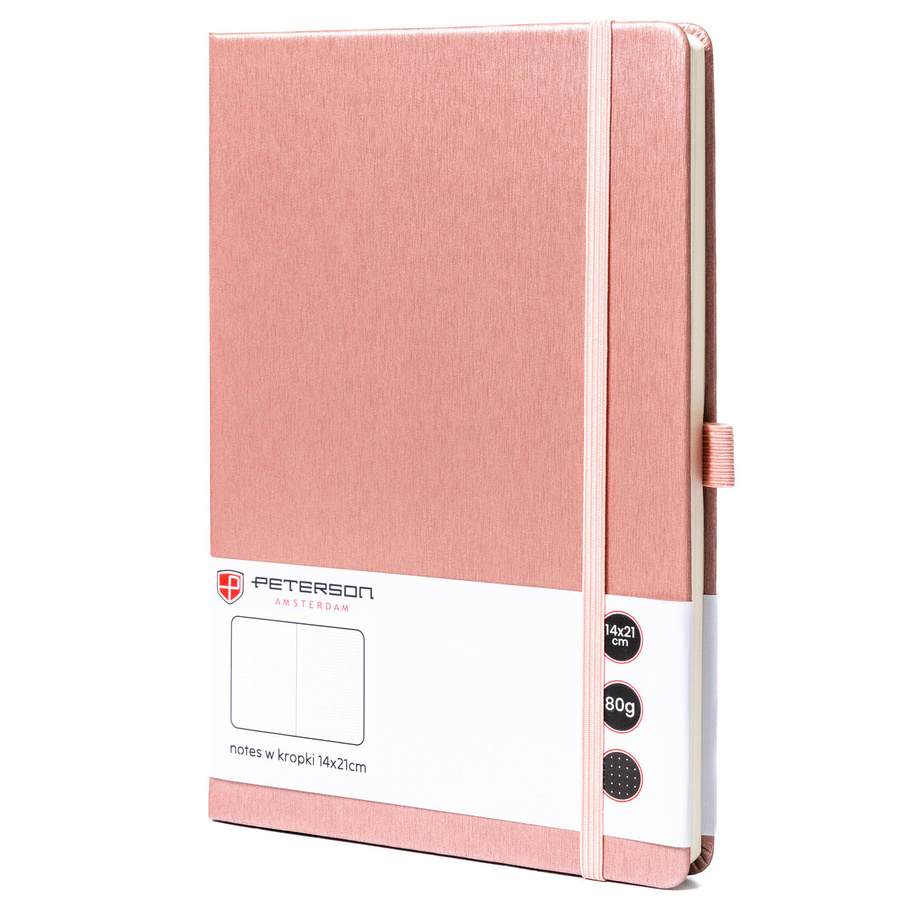 Różowy notes w formacie A5 zadrukowany w kropki, wyposażony w gumkę zamykającą - Peterson