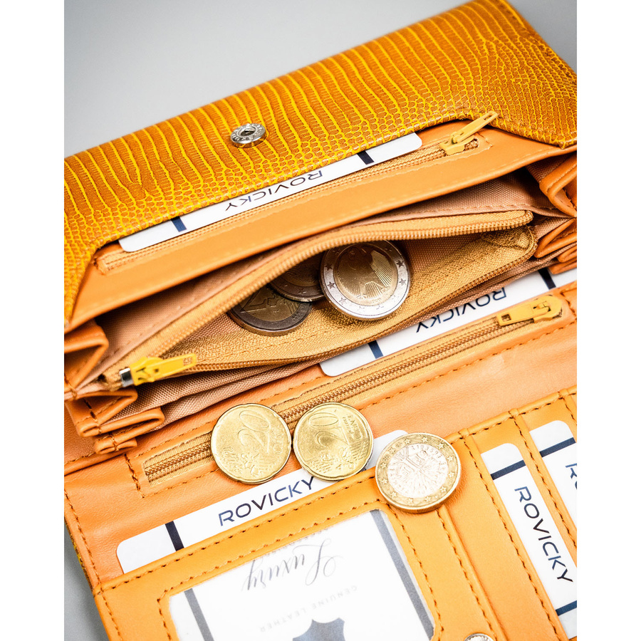 Portfel posiada osobne przegrody na banknoty oraz praktyczną kieszonkę na monety, zapinaną na suwak. Dzięki temu gotówka jest dobrze zabezpieczona i zawsze uporządkowana. Rozkładane wnętrze ułatwia szybkie płacenie i wygodne sortowanie pieniędzy, bez obawy o ich przypadkowe wypadnięcie.
