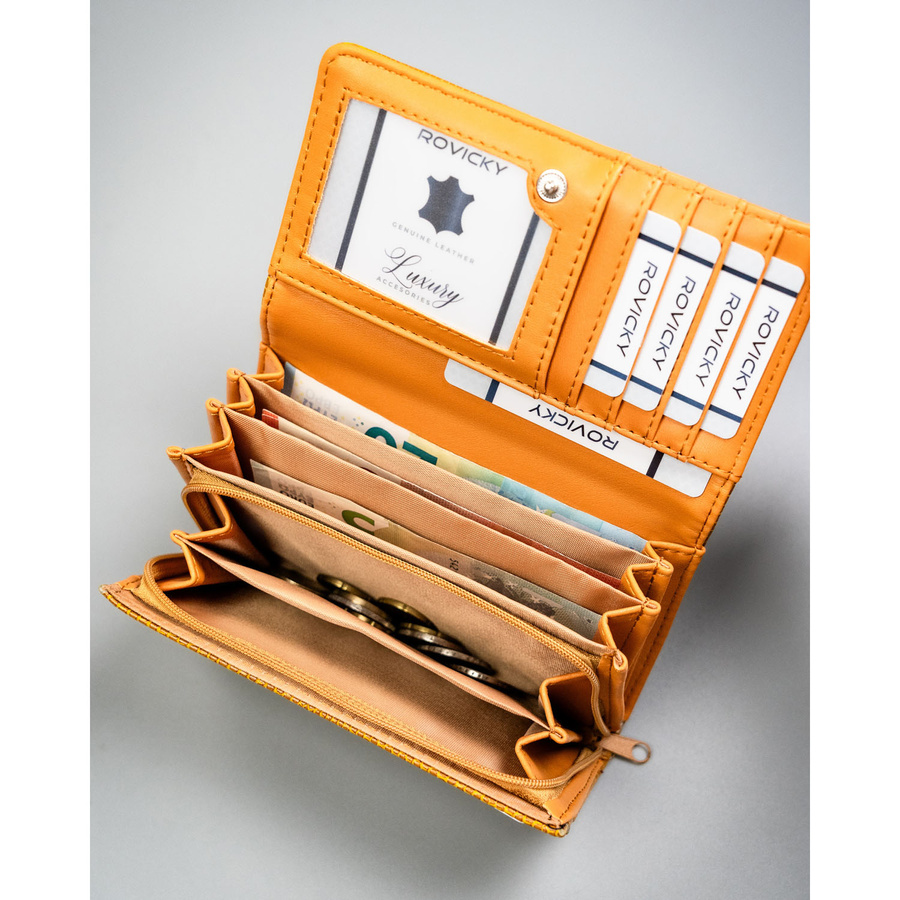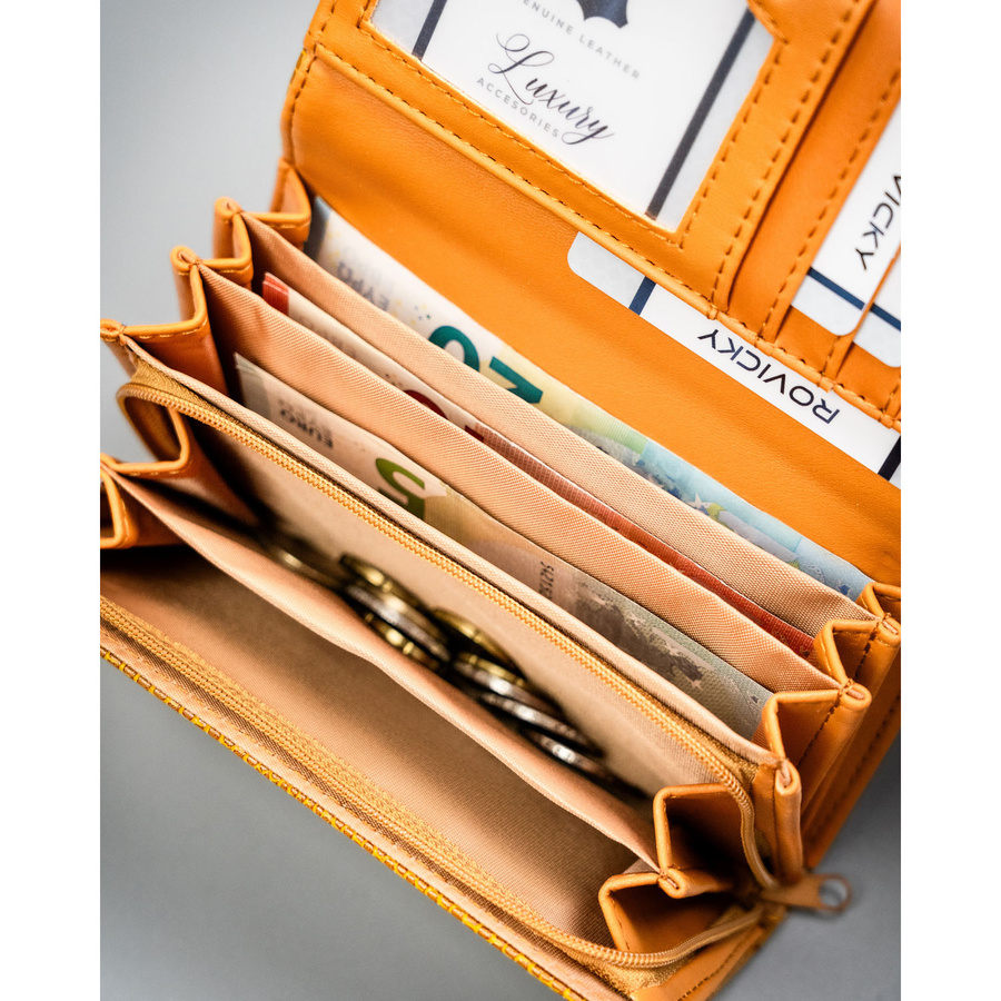 Wnętrze portfela zaprojektowano tak, aby najważniejsze informacje zawsze były pod ręką. Do dyspozycji jest 5 przegródek na karty, dzięki którym szybko znajdziesz potrzebną. Dodatkowe 4 schowki na dokumenty zapewniają wygodny dostęp.
