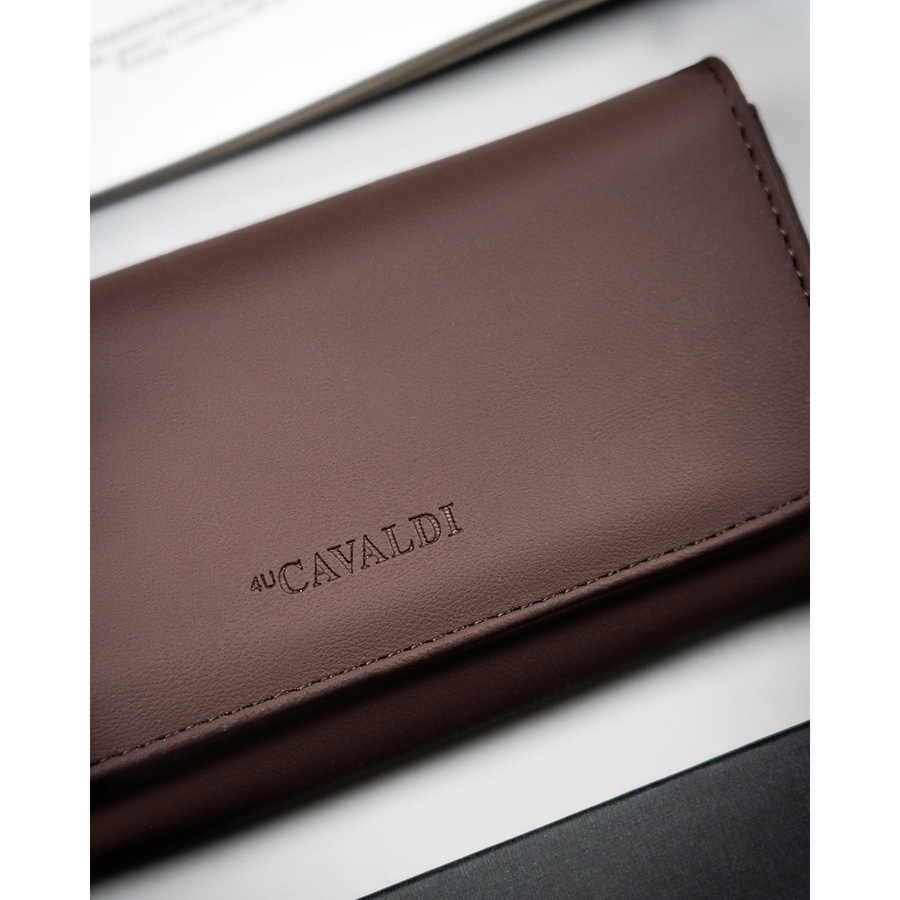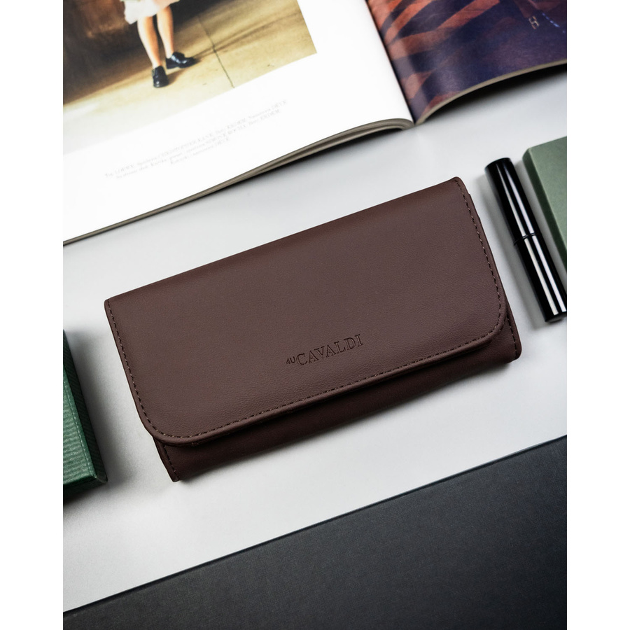 Brązowy, duży portfel damski ze skóry ekologicznej z kieszonką zewnętrzną, zamykany na zatrzask - 4U Cavaldi