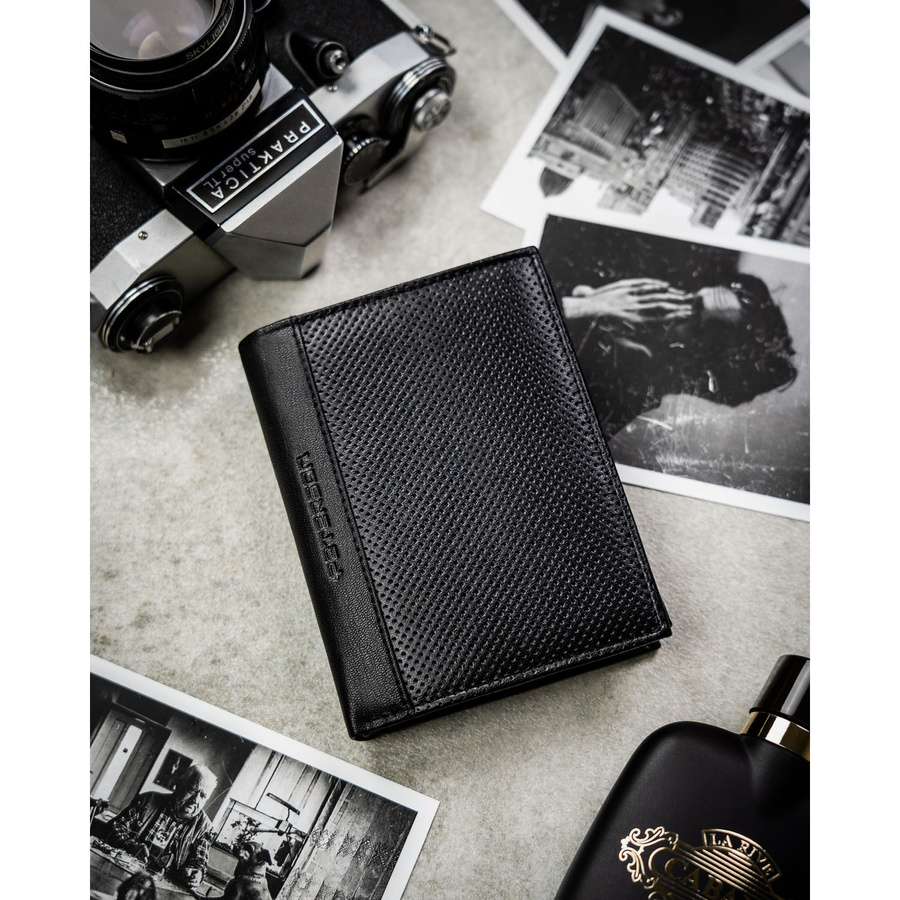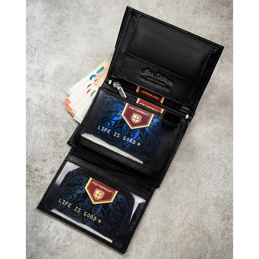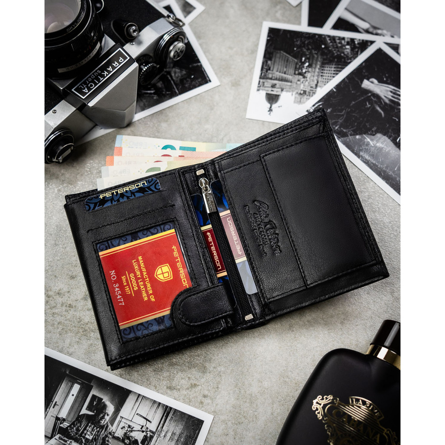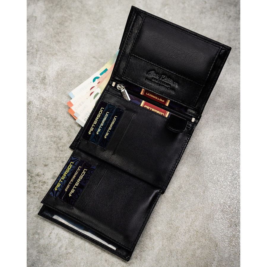 Zestaw prezentowy: skórzany, pionowy portfel męski w czarnym kolorze bez zapięcia i czarny pasek ze skóry ekologicznej - Peterson