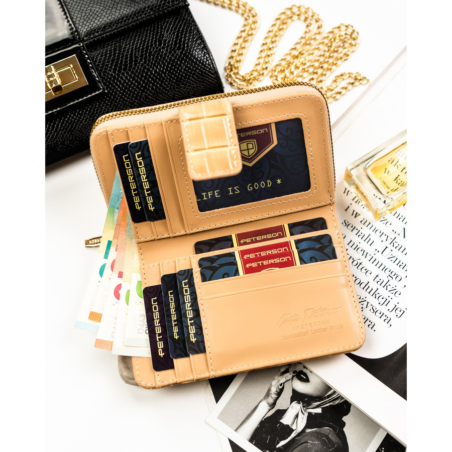 Beżowy portfel damski ze skóry ekologicznej z tłoczeniem na wzór skóry krokodyla, zamykany na zatrzask i suwak - Peterson