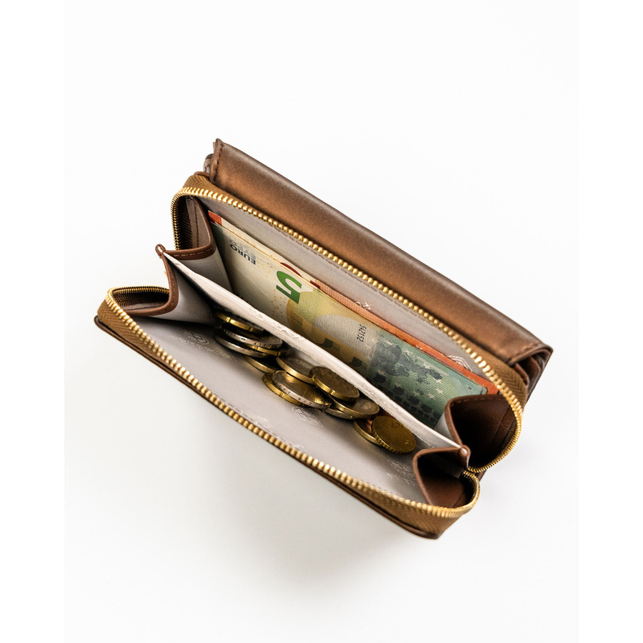 - Podwójna kieszeń na bilon zamykana na suwak.