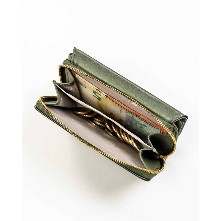 - Podwójna kieszeń na bilon zamykana na suwak.