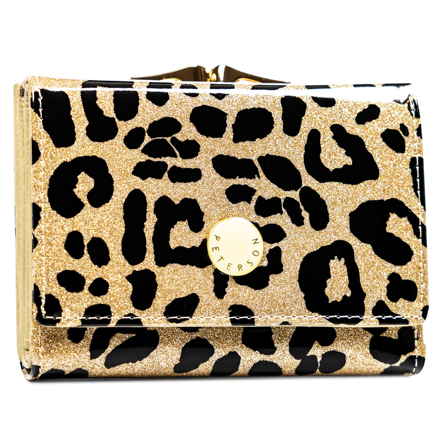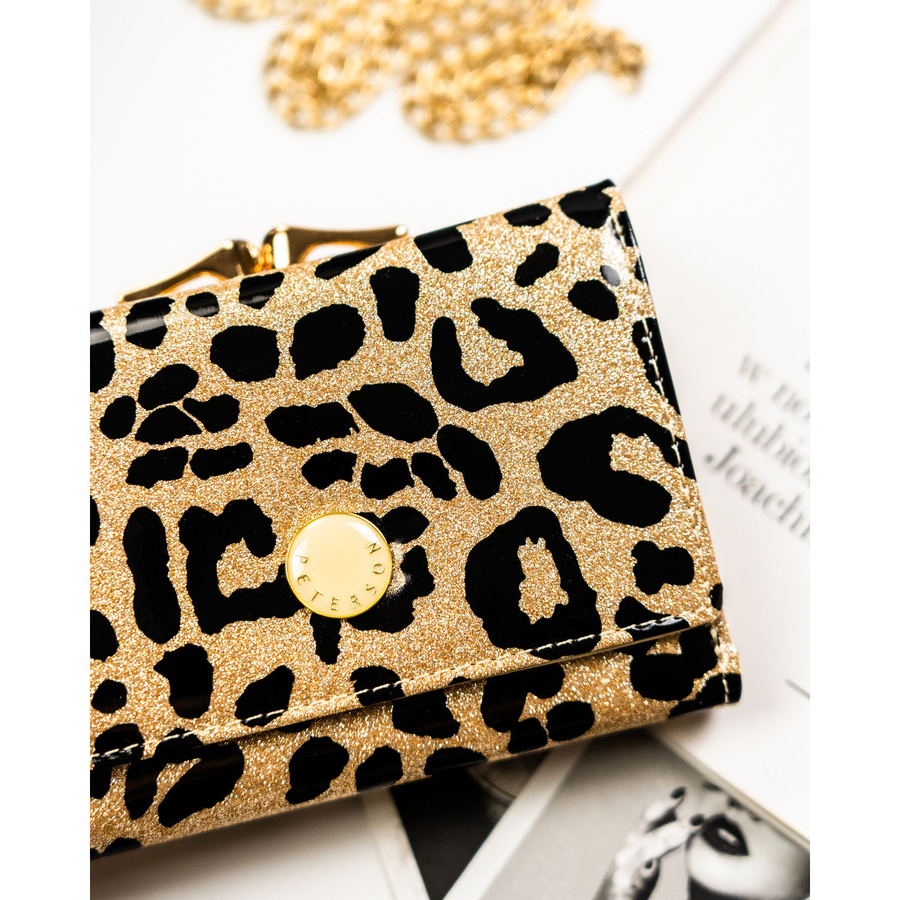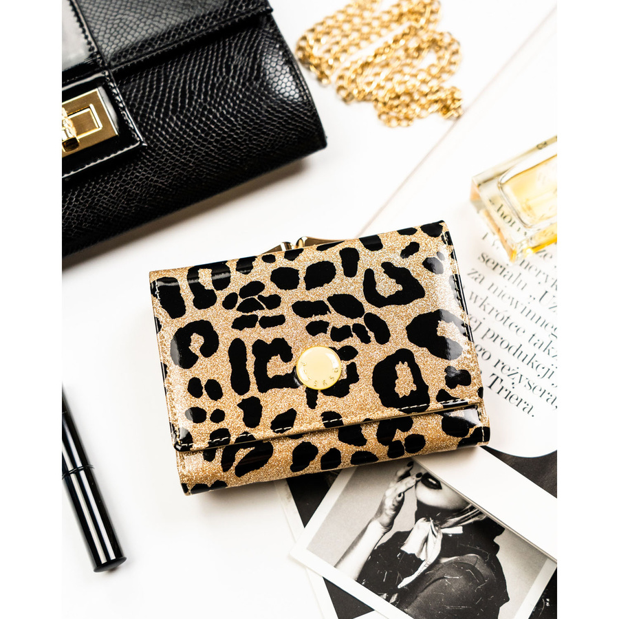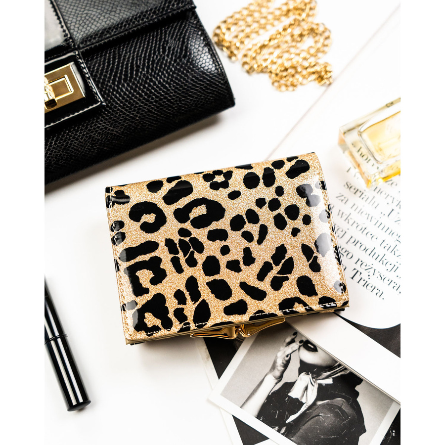 Złoty portfel damski ze skóry ekologicznej i naturalnej w cętki, zamykany biglem i zatrzaskiem - Peterson