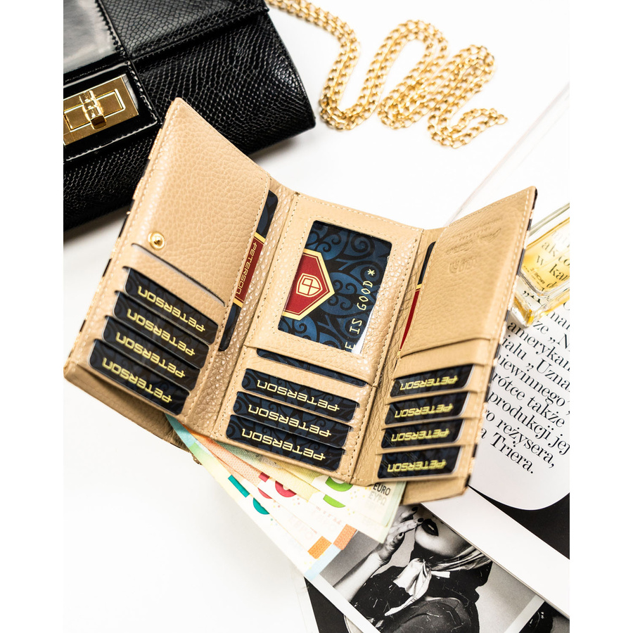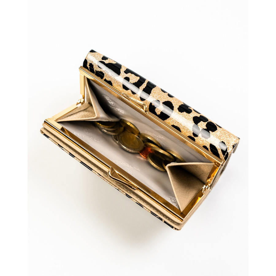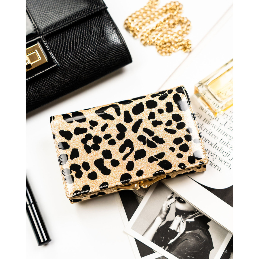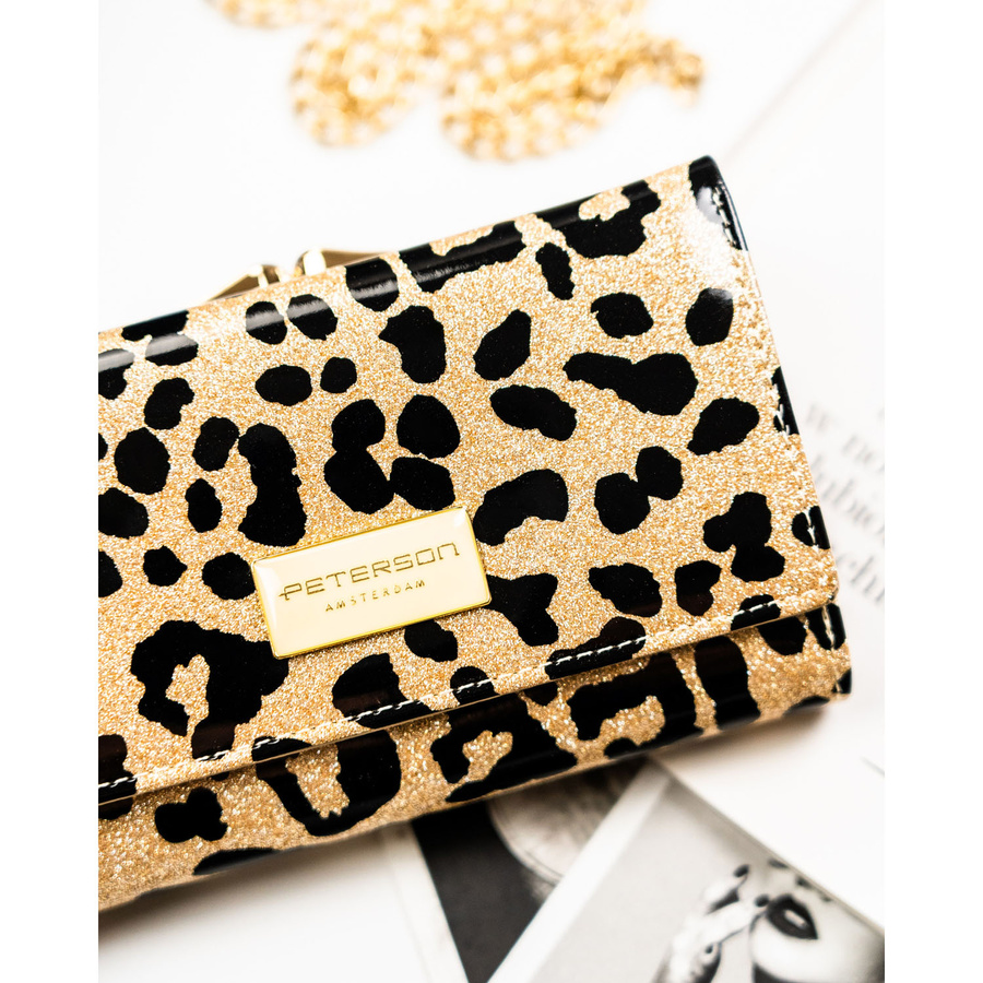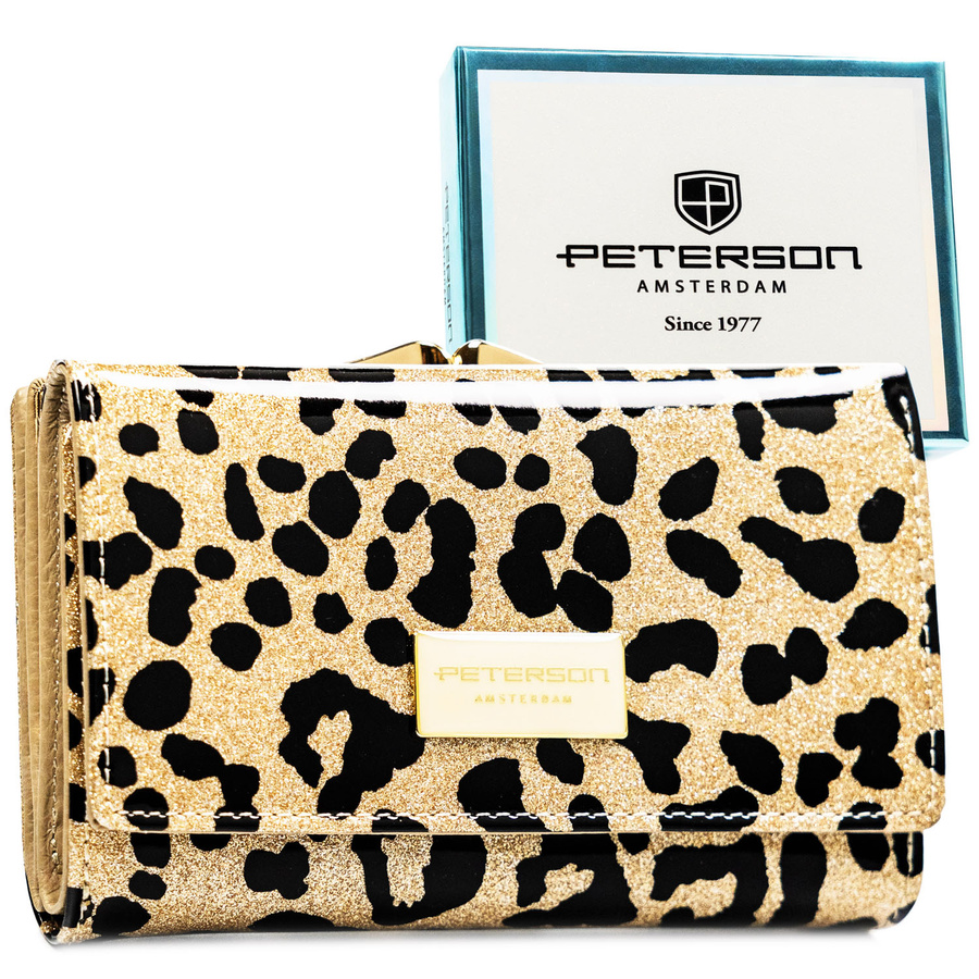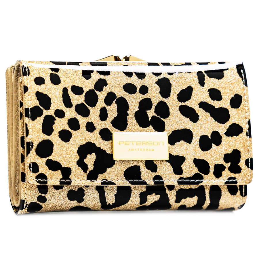 Złoty portfel damski ze skóry ekologicznej i naturalnej w cętki, zamykany biglem i zatrzaskiem - Peterson