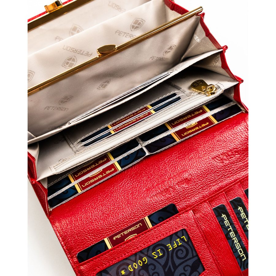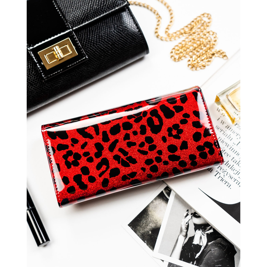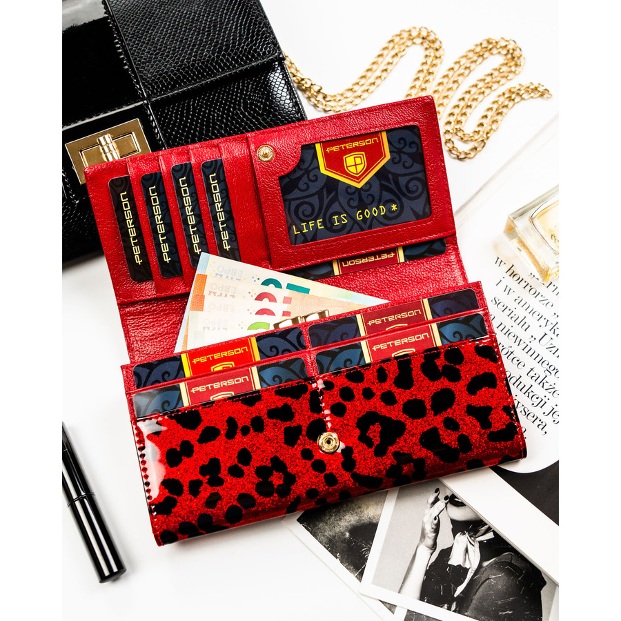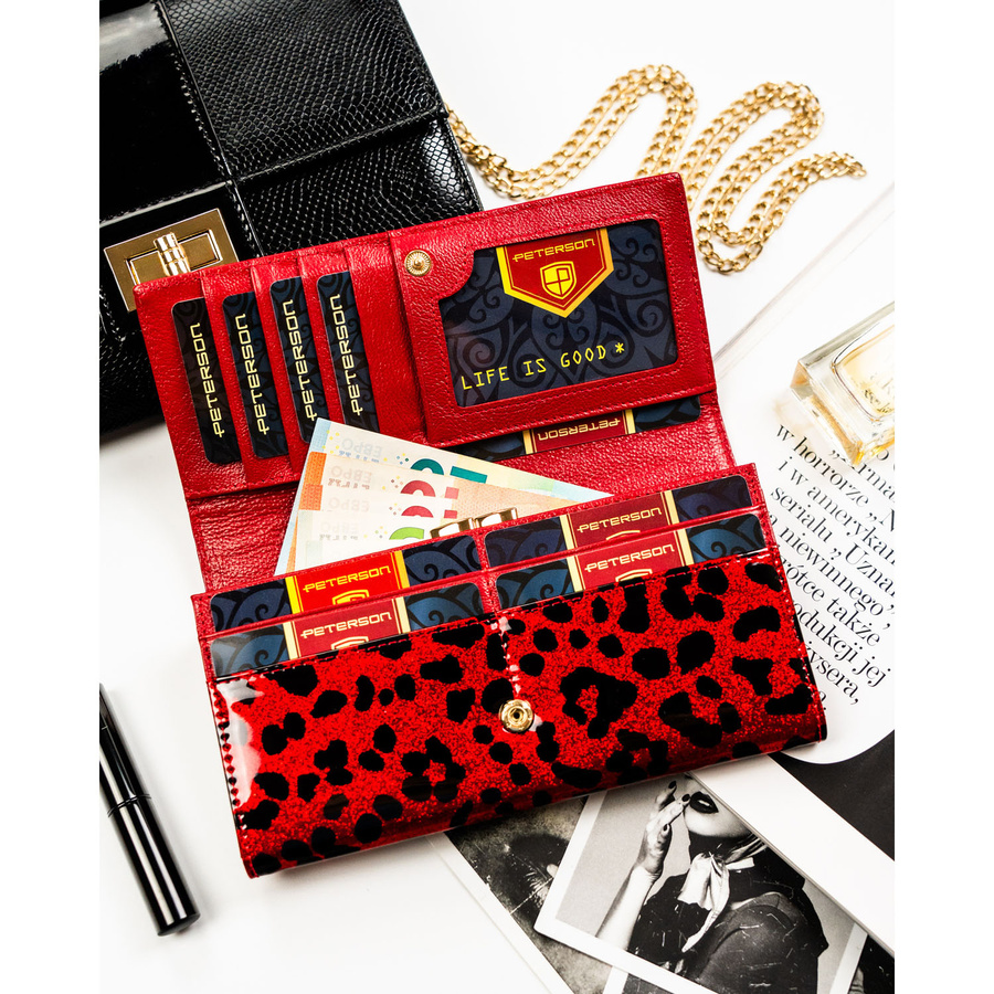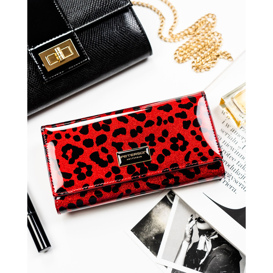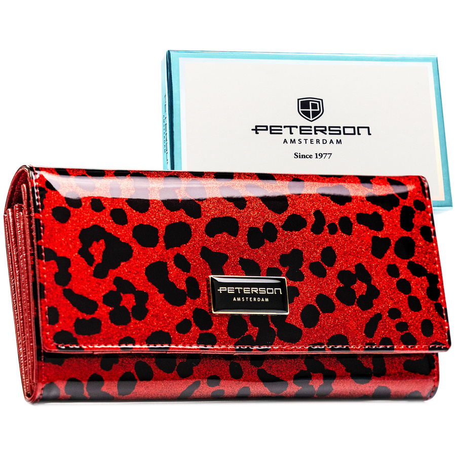 Czerwony, duży portfel damski ze skóry ekologicznej i naturalnej w cętki, zamykany zatrzaskiem - Peterson