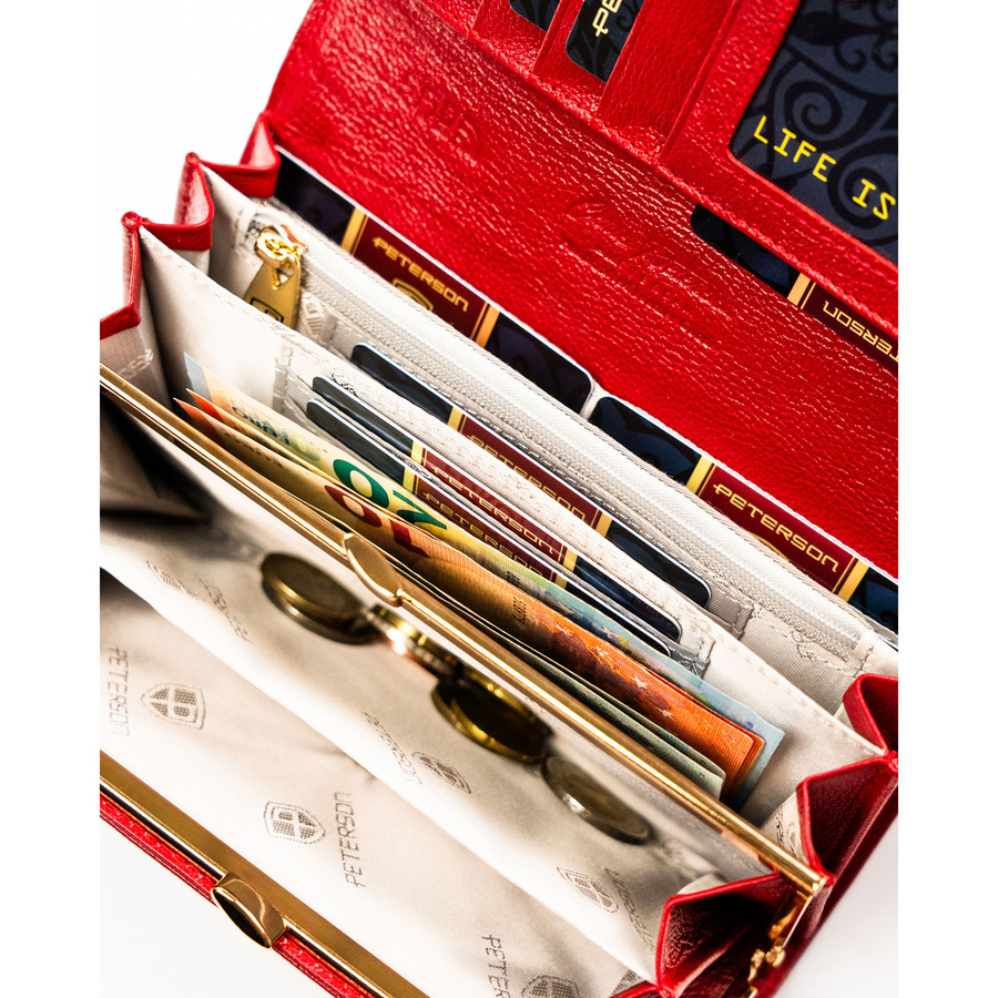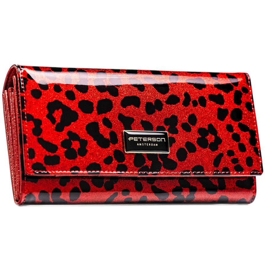 Czerwony, duzy portfel damski ze skóry ekologicznej i naturalnej w cętki, zamykany zatrzaskiem - Peterson