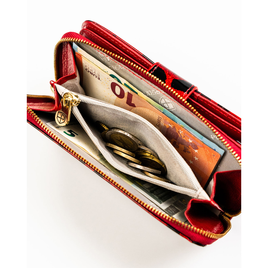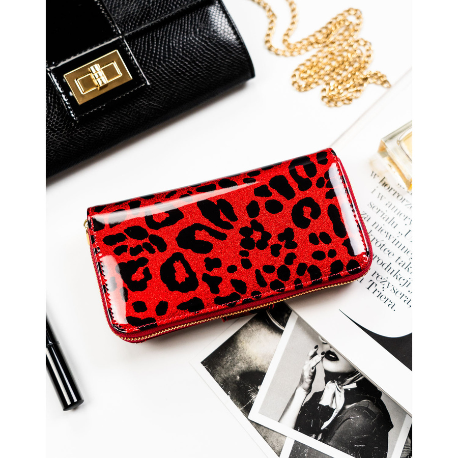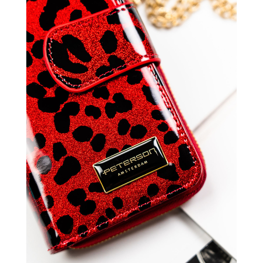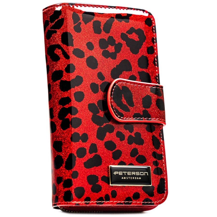 Czerwony, pionowy portfel damski ze skóry ekologicznej i naturalnej w cętki, wyposażony w system RFID - Peterson