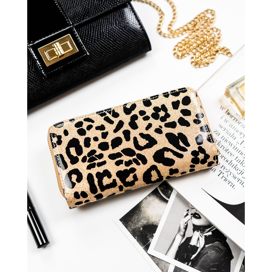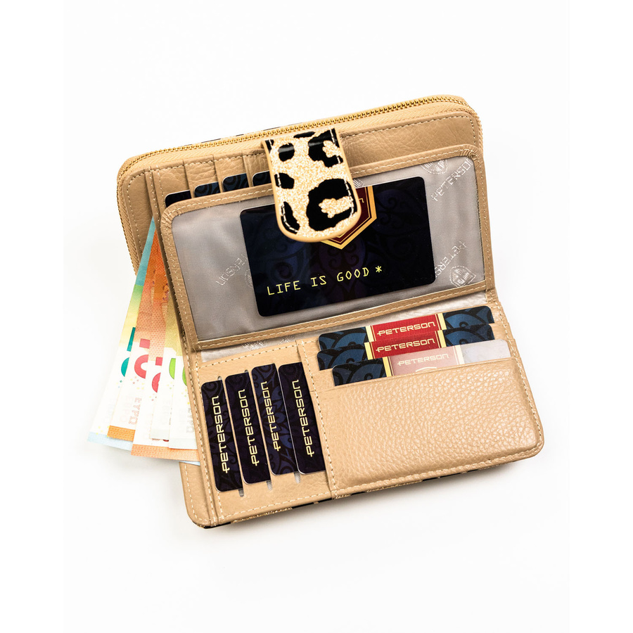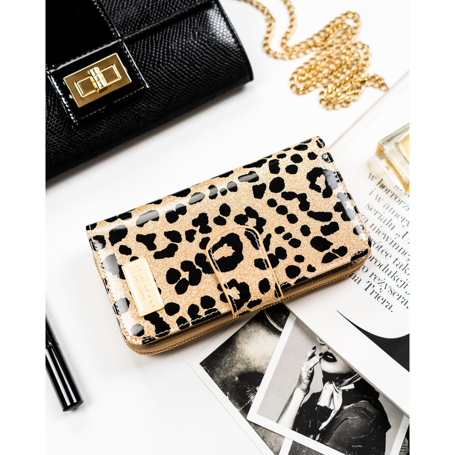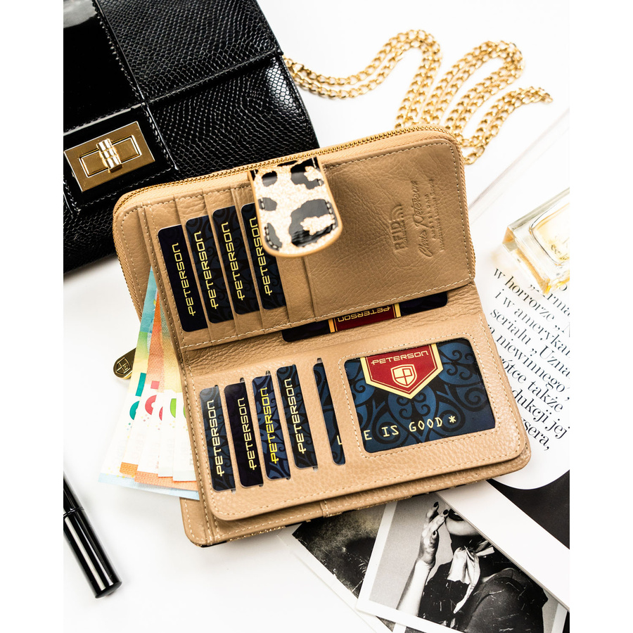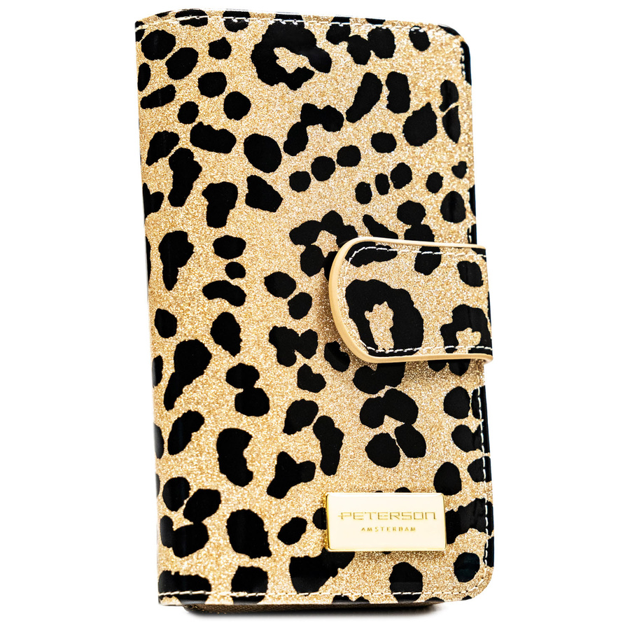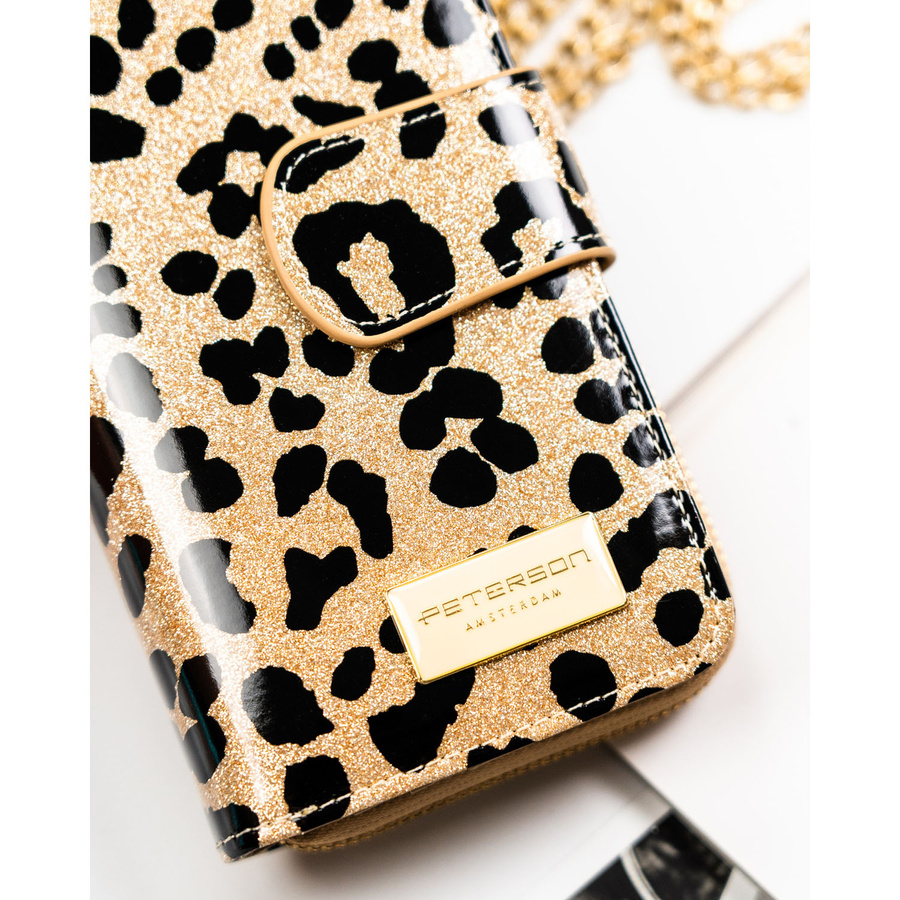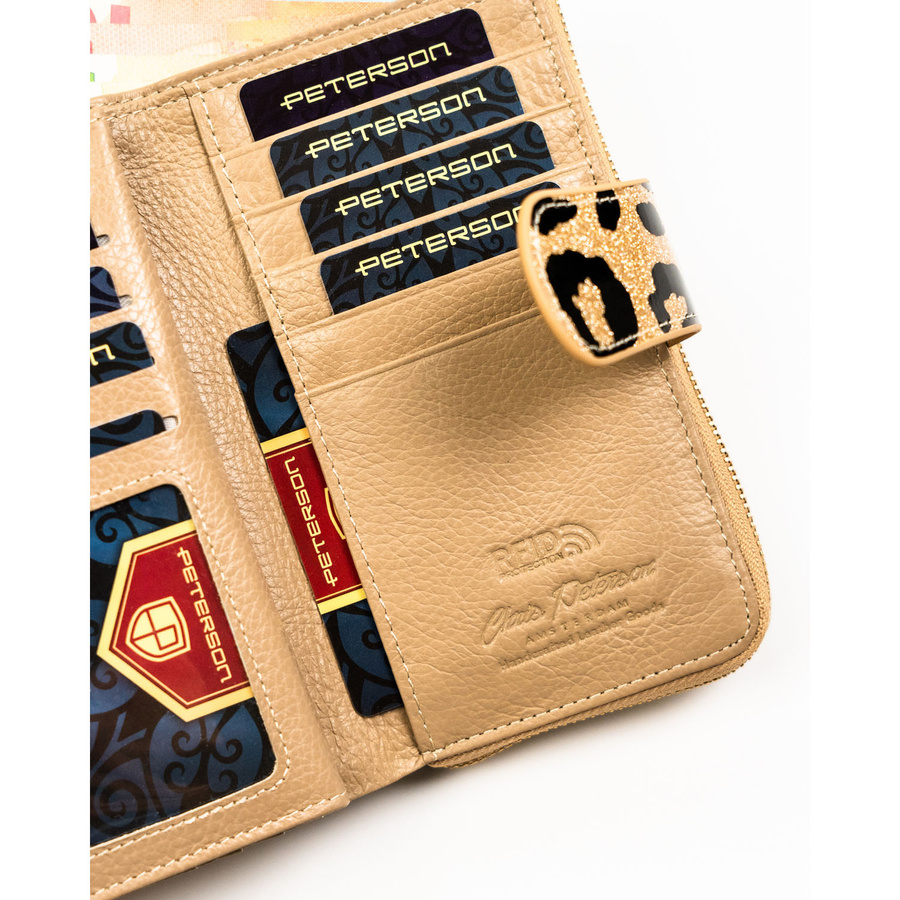 Złoty, pionowy portfel damski ze skóry ekologicznej i naturalnej w cętki, wyposażony w system RFID - Peterson