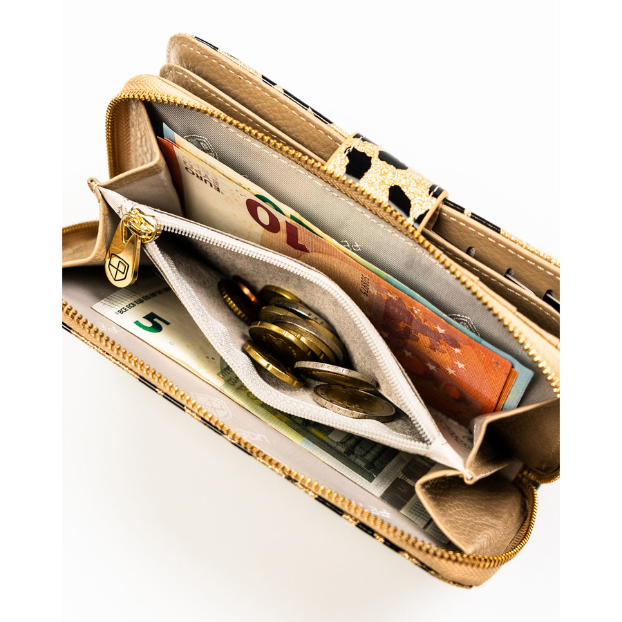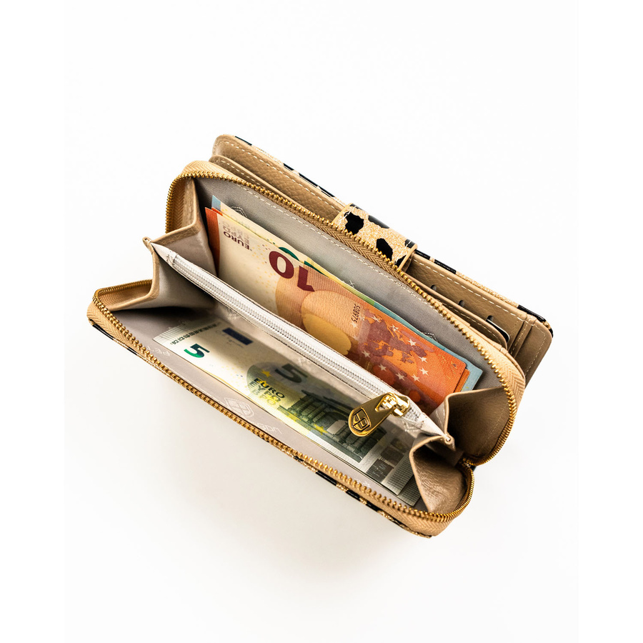- W środku znajdziesz 2 osobne schowki na banknoty — to idealne rozwiązanie, jeśli używasz kilku walut lub chcesz oddzielić gotówkę na różne cele.