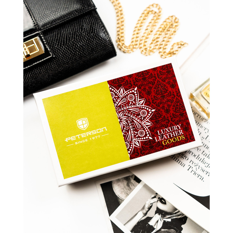 Całe wnętrze wykończono elegancką podszewką z motywem logo PETERSON®, która zabezpiecza zawartość oraz dodaje portfelowi unikalnego charakteru.