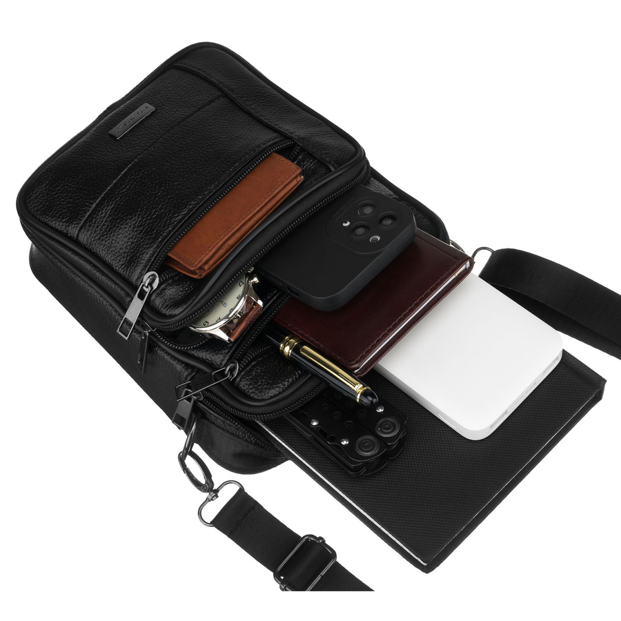 • Torba wykonana z wysokiej jakości naturalnej skóry w czarnym kolorze. Ma aż 5 kieszeni ułatwiających organizację najważniejszych rzeczy. Zamykana na solidny suwak. Wyposażona w regulowany, dopinany pasek.