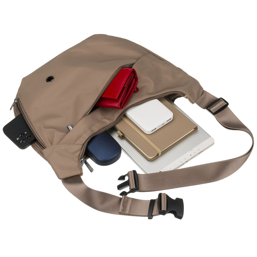 - Pojemną komorę główną, która zmieści portfel, smartfon, notatnik, kosmetyczkę czy mały tablet.