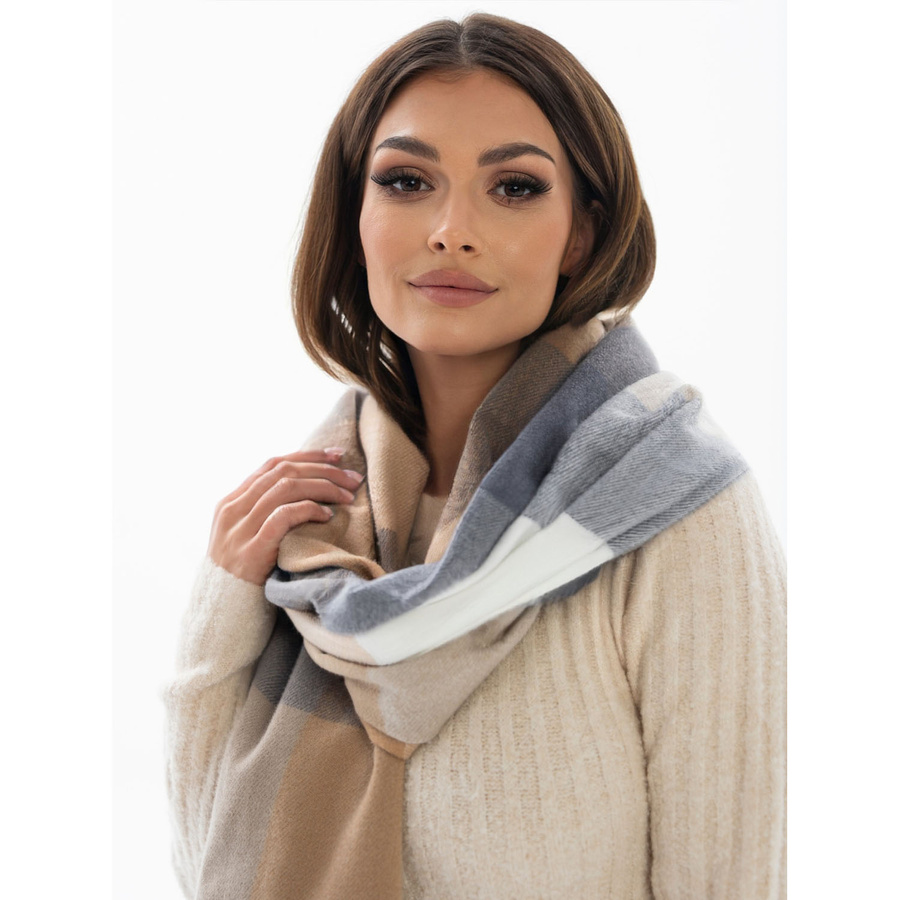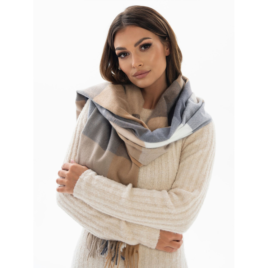 legancki szalik dwustronny cechuje się ponadczasowym geometrycznym wzorem, który nadaje mu eleganckiego, a zarazem unikalnego charakteru. Dominują stonowane odcienie beżu,brązu i khaki. Końce szalika zdobią subtelne frędzle, które dodają całości stylowego wykończenia, podkreślając jego nowoczesny wygląd.