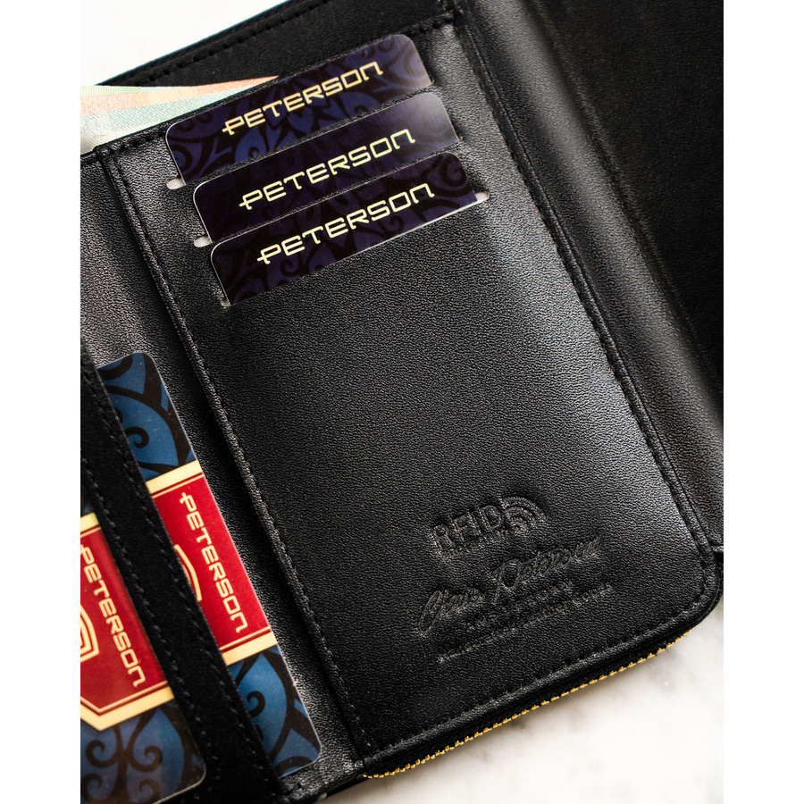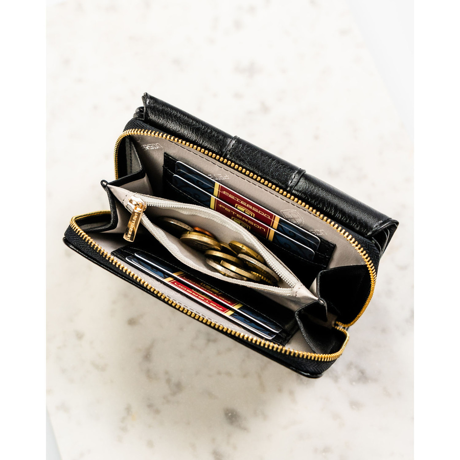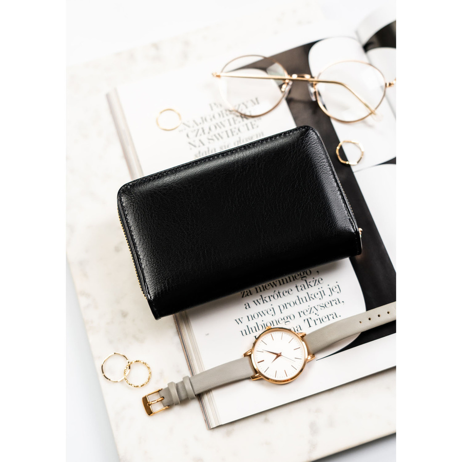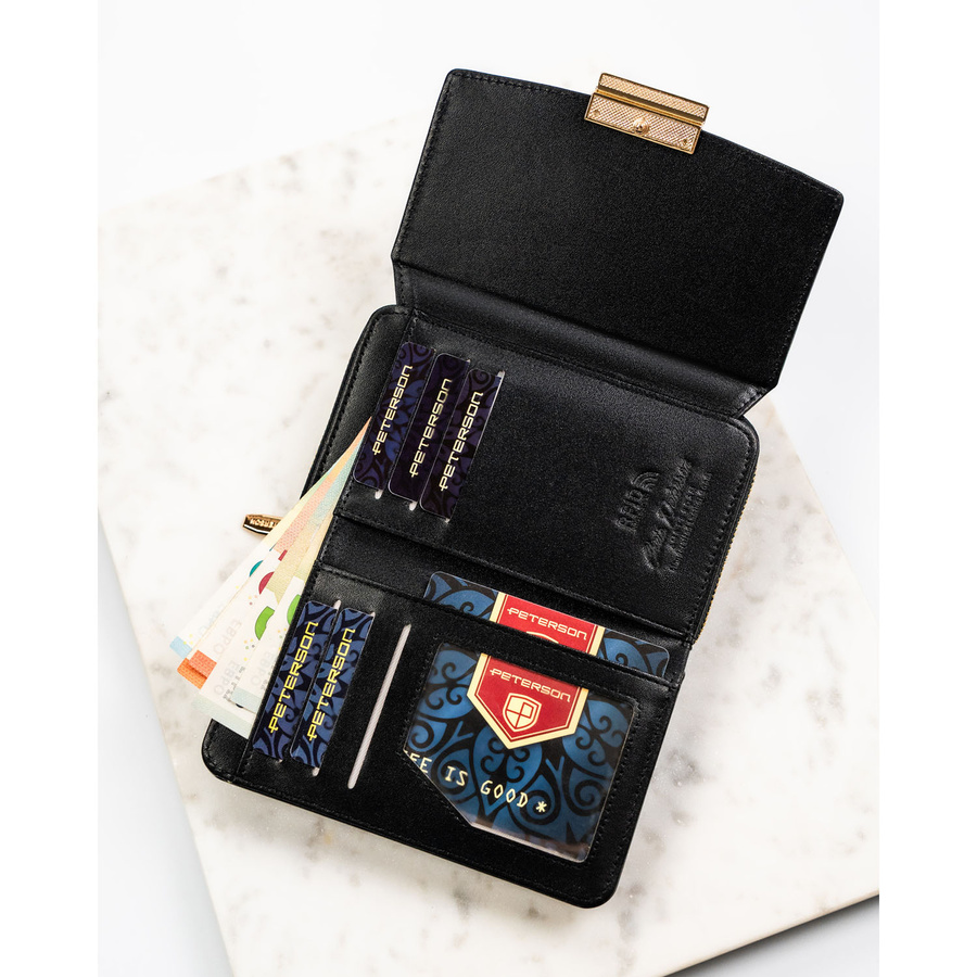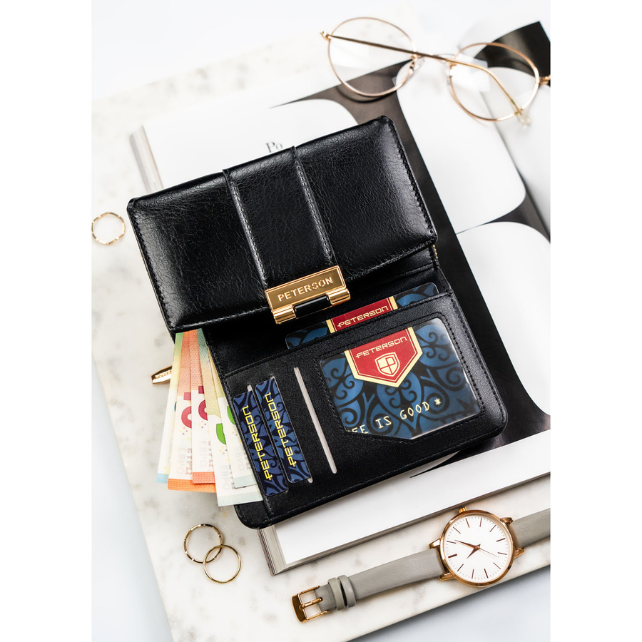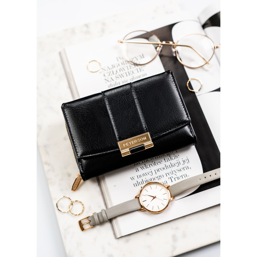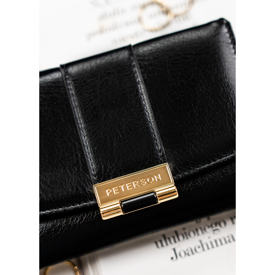 Poziomy portfel damski wykonany ze skóry ekologicznej w czarnym kolorze, zamykany na zatrzask - Peterson