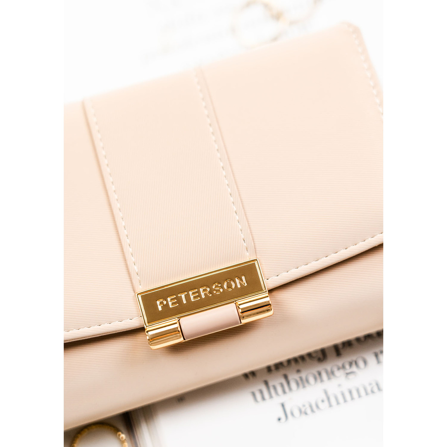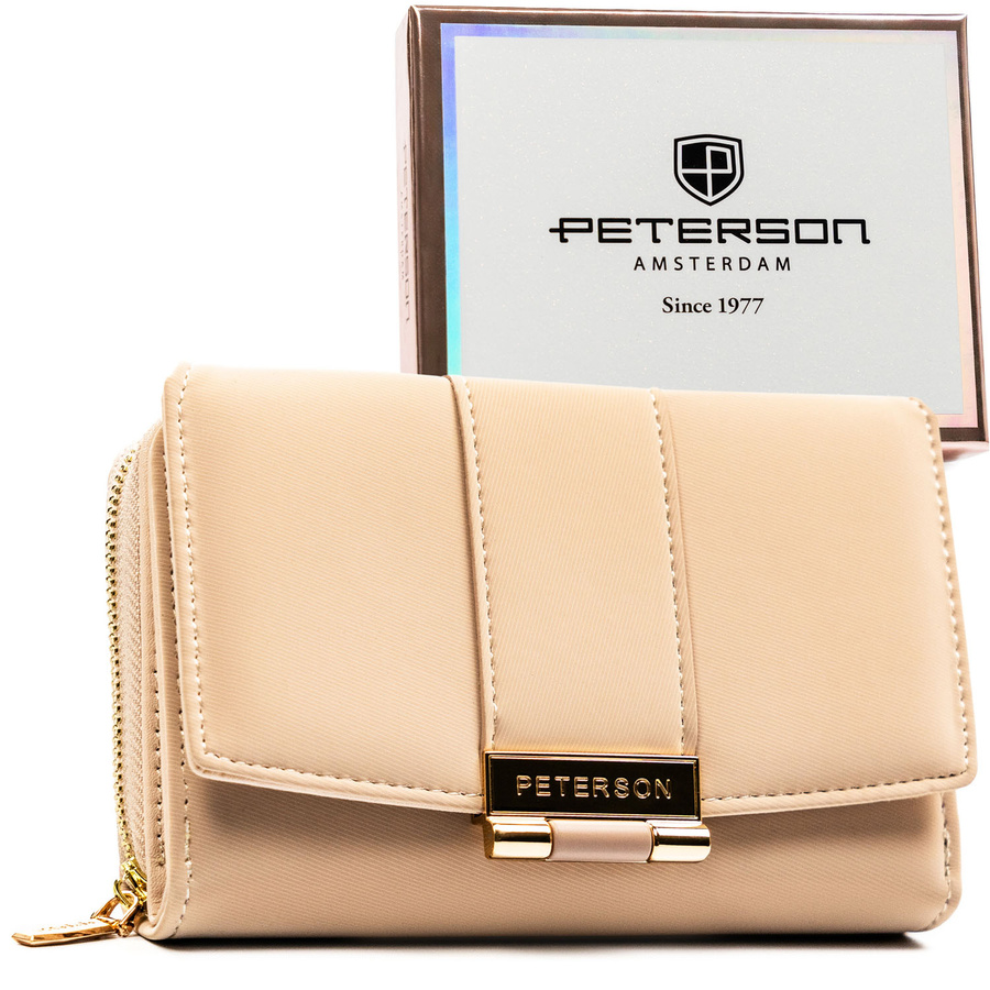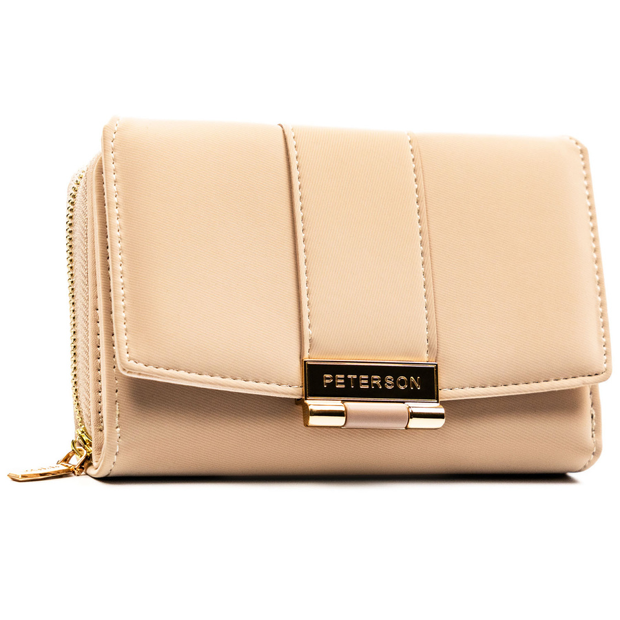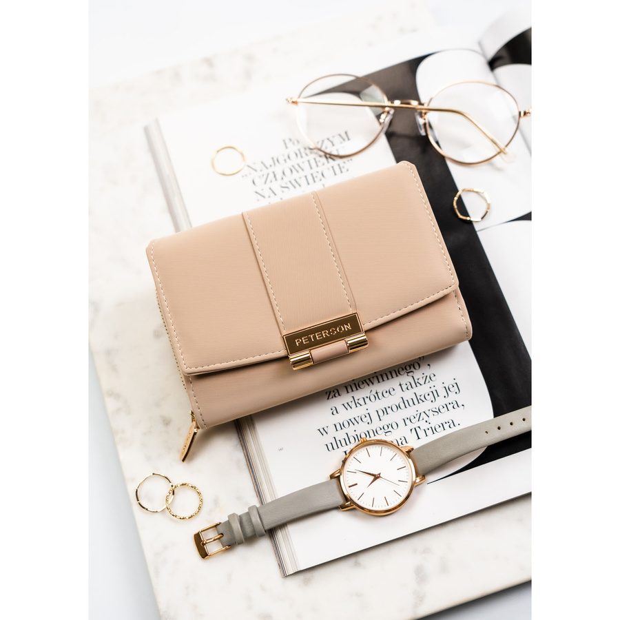 Beżowy portfel damski wykonany ze skóry ekologicznej o lekko prążkowanej fakturze, zamykany zatrzaskiem - Peterson