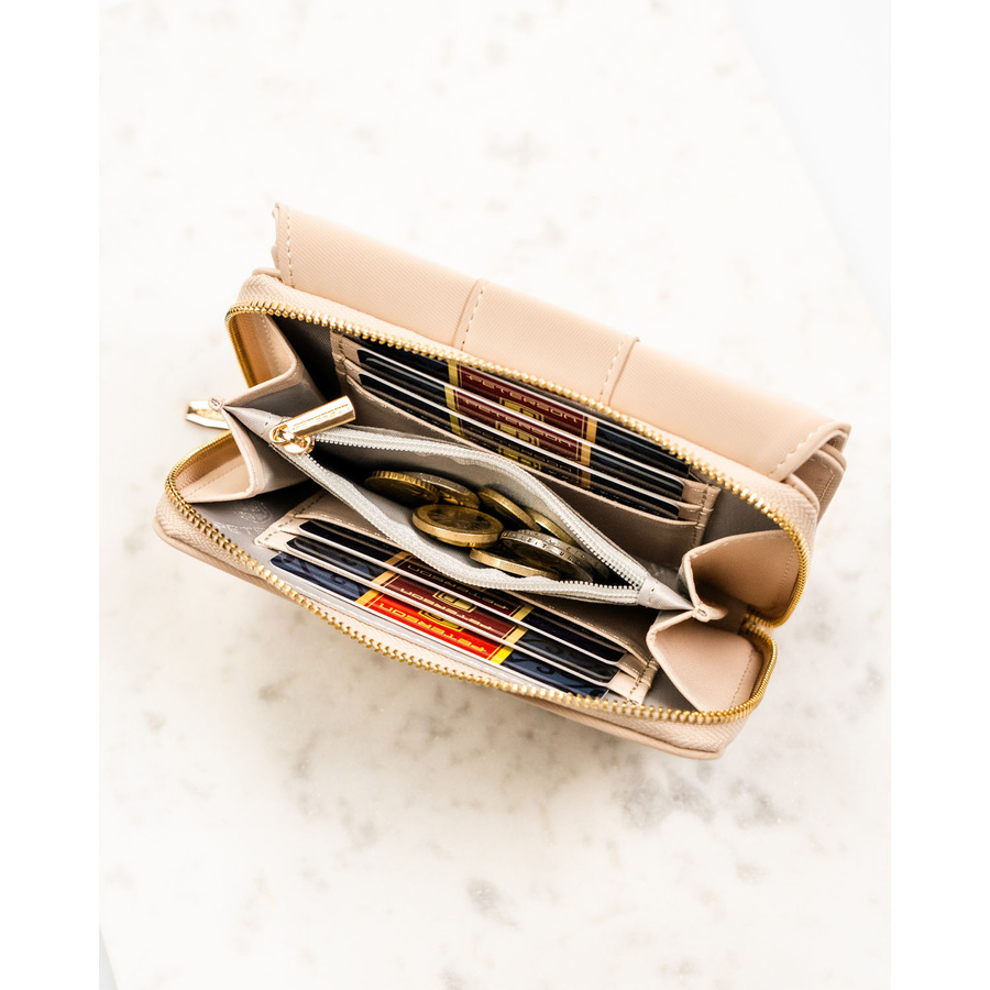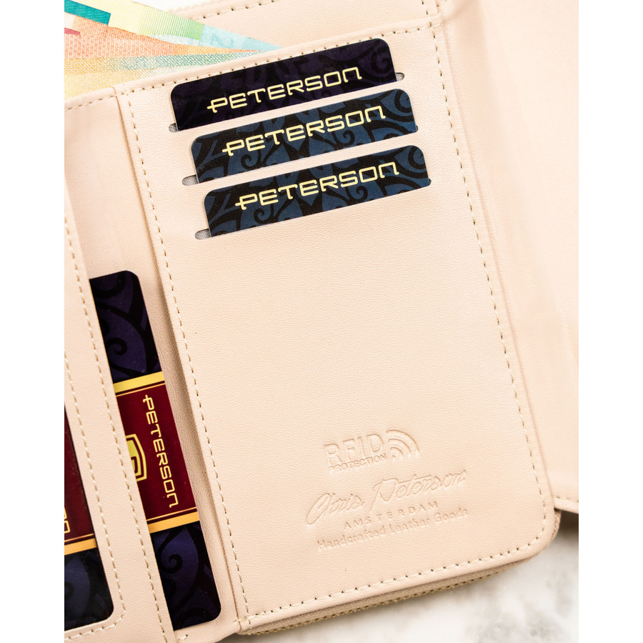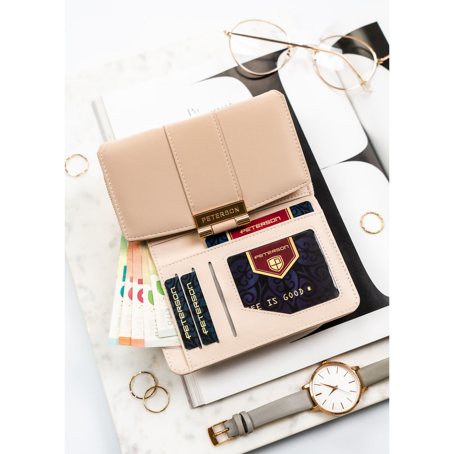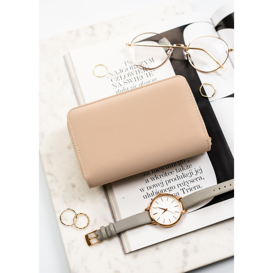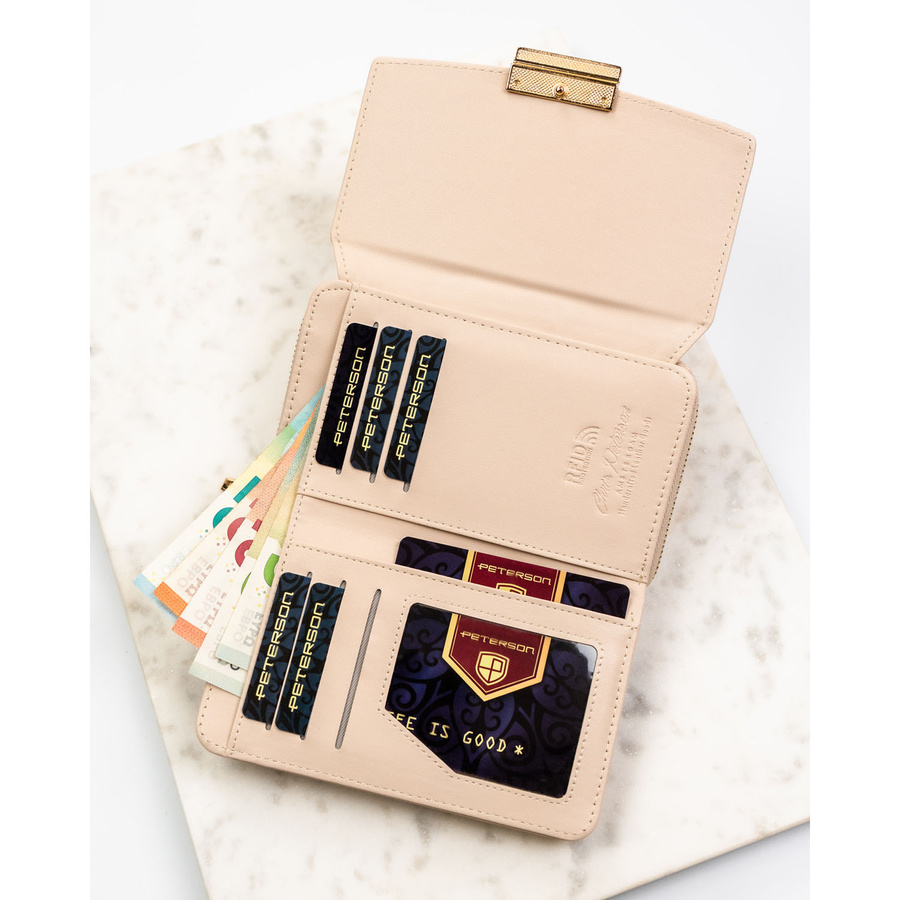 Beżowy portfel damski wykonany ze skóry ekologicznej o lekko prążkowanej fakturze, zamykany zatrzaskiem - Peterson